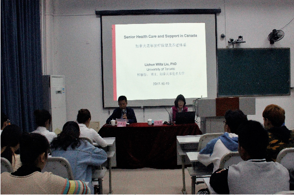 报告会上,柳丽春博士围绕“加拿大的人口老龄化”、“初级卫生保健系统”、“长期护理”、“家庭护理”、“临终护理”五个方面展开分析。她指出,加拿大的医保体系十分完善,具有普遍性、可达性、便携性、综合性、非盈利性的特点,这正是加拿大养老保障体系先进的重要原因。随后,她就加拿大的老年医疗保健体系建设问题,进一步分析了人口老龄化的原因与应对措施,并就中国医疗保健体系改革提出了建设性意见。最后,柳丽春针对未来养老产业的机遇与挑战作了详细讲述,强调未来的研究课题应侧重于体系的改革与完善。会后,对于现场同学们的提问,柳春丽耐心解答。现场气氛活跃,会议取得圆满成功。