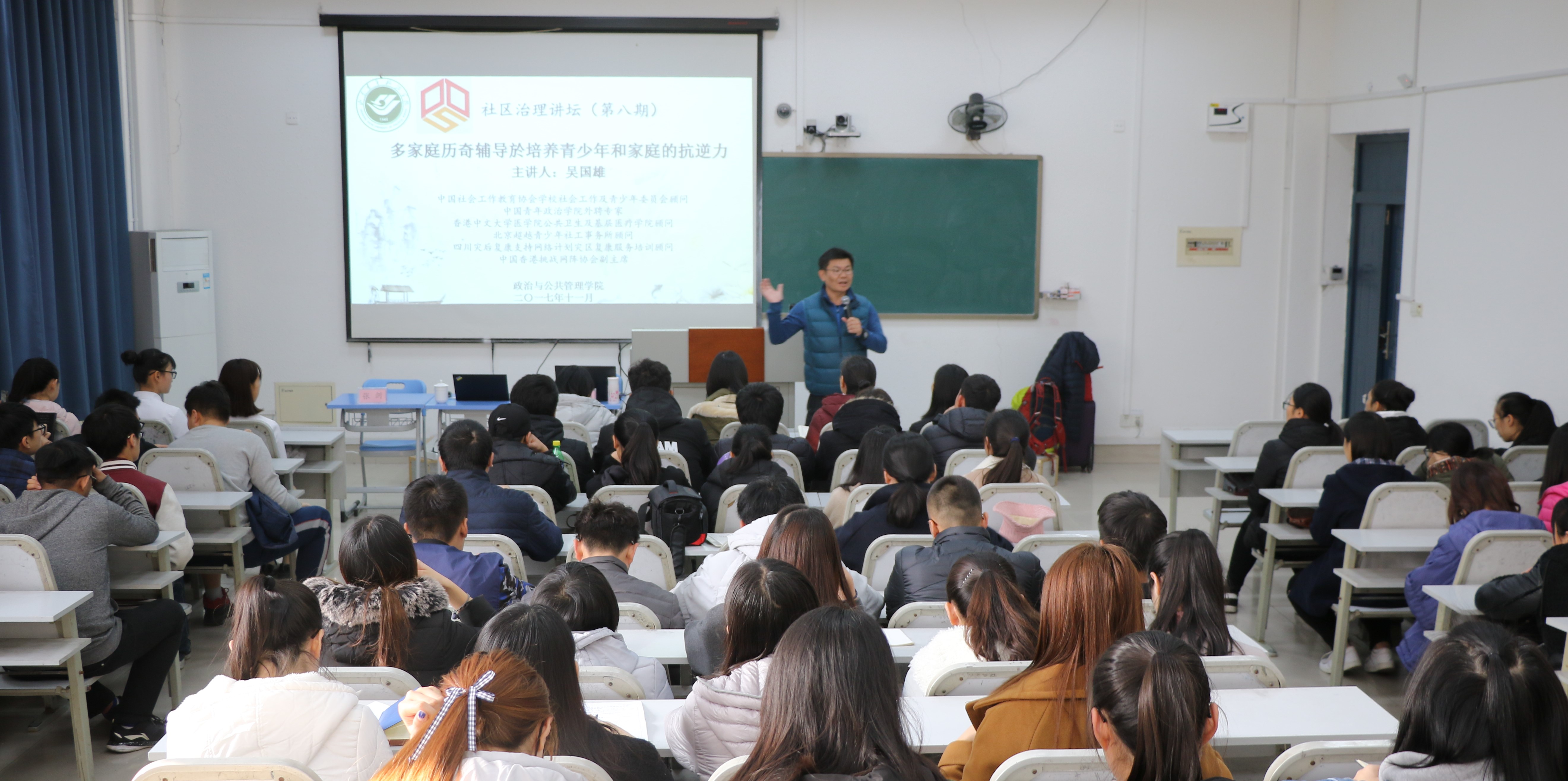 近日,由政治与公共管理学院主办的第八期社区治理论坛讲座于电教楼102室成功举行。香港理工大学社会工作专业博士吴国雄应邀做了题为“多家庭历奇辅导与培养青少年和家庭的抗逆力”的学术报告。16级、17级社会工作专业与老年服务与管理专业的部分师生共同聆听了此次学术讲坛,本次讲坛由张剑主持。