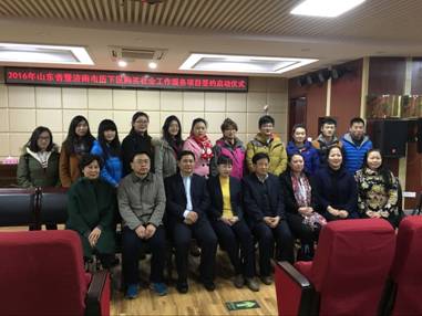 2016年1月7日下午,山东省暨济南市历下区购买社会工作服务签约启动仪式在历山路社区居委会多功能会议厅举行。省民政厅副厅长冯建国、基层政权和社区建设处处长蒋德生、副处长田志梅,市民政局副局长杜红波、组织人事处处长赛绪芬,历下区委常委、副区长尹红梅,历下区民政局局长苏凤清等领导、历下区各承接社工服务街道办事处及社区居委会代表、承接购买服务的各社工机构理事长以及历下区全体项目社工共同出席本次签约仪式。山东青年政治学院政治与公共管理学院院长、济南山青社会工作服务中心理事长王玉香教授受邀出席,济南山青社会工作服务中心总干事孙成键以及山青社工历下服务项目社工参加会议。