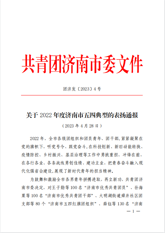 近日,共青团济南市委近日下发了《关于2022年度济南市五四典型的表扬通报》。在此次评选中,政治与公共管理学院启明星青年志愿服务社获评2022年度“济南市青年志愿服务先进集体”。