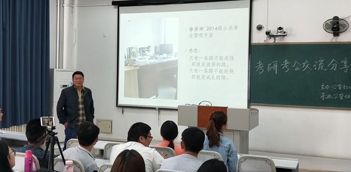 为提高同学们对公务员、研究生、事业编考试的认识和了解,促进同学们对未来的规划,公共管理协会于5月3日下午二点在电教102顺利举行了考公考研交流会,政管学院老师刘庆顺,老师韩瑶,老师臧文杰,2014级学生任志伟,王雨颖,徐泽坤和2015级、2016级、2017级学生参加此次活动。