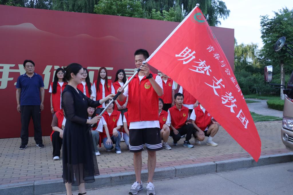 支教团出发前,丁萍为支教团授旗,并勉励大家要牢固树立“安全第一”的同时,在团结互助、奉献友爱中成长自己,与所教青少年同奋进共成长。同时,她从同学们的个人成长、团队建设、社会需求等方面向志愿者提出要求,一是践行志愿服务奉献友爱互助进步的宗旨,发挥专业的特长,为留守青少年带去别开生面的特色课程,共同开启多彩的假期学习生活;二是坚持“教育载智德”,注重学校的教学要求,认真沟通做到耐心、认真,用仁爱来引导学生的价值观。她认为这次支教经历必将成为每一位志愿者人生中宝贵的财富,希望志愿者们能够克服艰苦条件,保持乐观态度,将“小我”融入“大我”,以实际行动奉献基层、助力社会发展。志愿者们纷纷表示,会谨记老师们的嘱托,用课堂所学到的专业知识、以饱满的精神面貌,用自身的实践行动去关心儿童、回报社会!