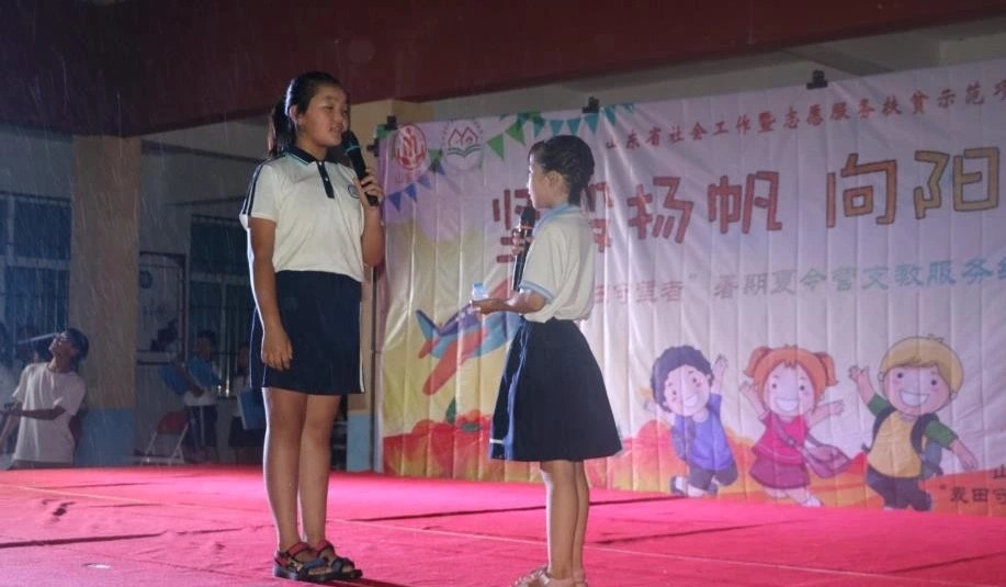 随后,汇报演出开始。整个演出充分展现了三周以来的支教服务成果。节目最后,全体志愿者合唱《送别》,在雨中向全体学生及家长深情道别。至此,“坚毅扬帆·向阳起航”结营仪式圆满结束。