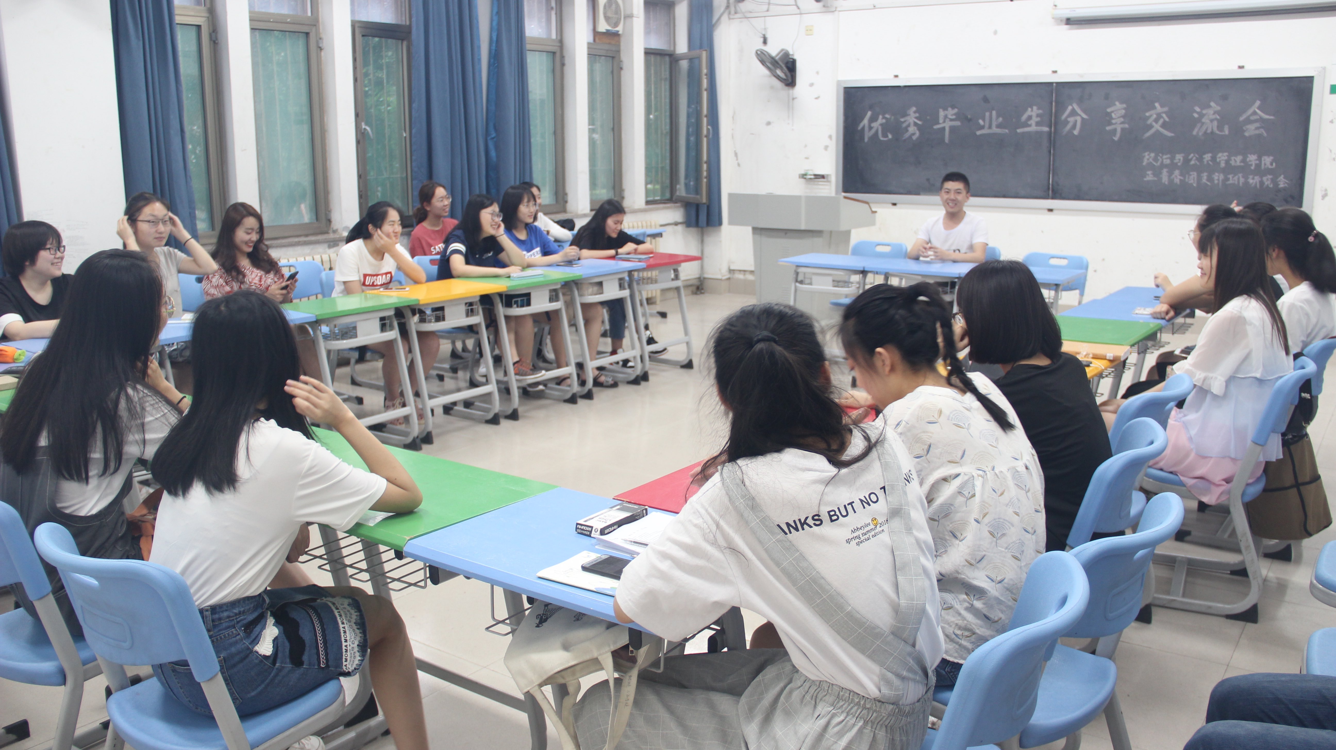 活动一:优秀毕业生分享交流会。6月11日晚,为发挥优秀毕业生的引领示范作用,政管学院于文外楼104室成功举办优秀毕业生分享会。成功考取了中南财经政法大学研究生的杜其君同学分享了自己对学习和工作的认识,他认为大学生的主要任务仍旧是学习,而这种学习不仅在于学习理论,还在于学习如何以一颗赤诚之心认识现实、融入社会。