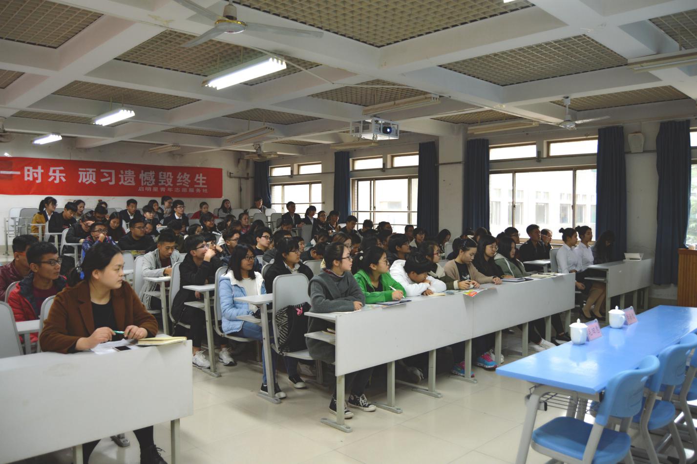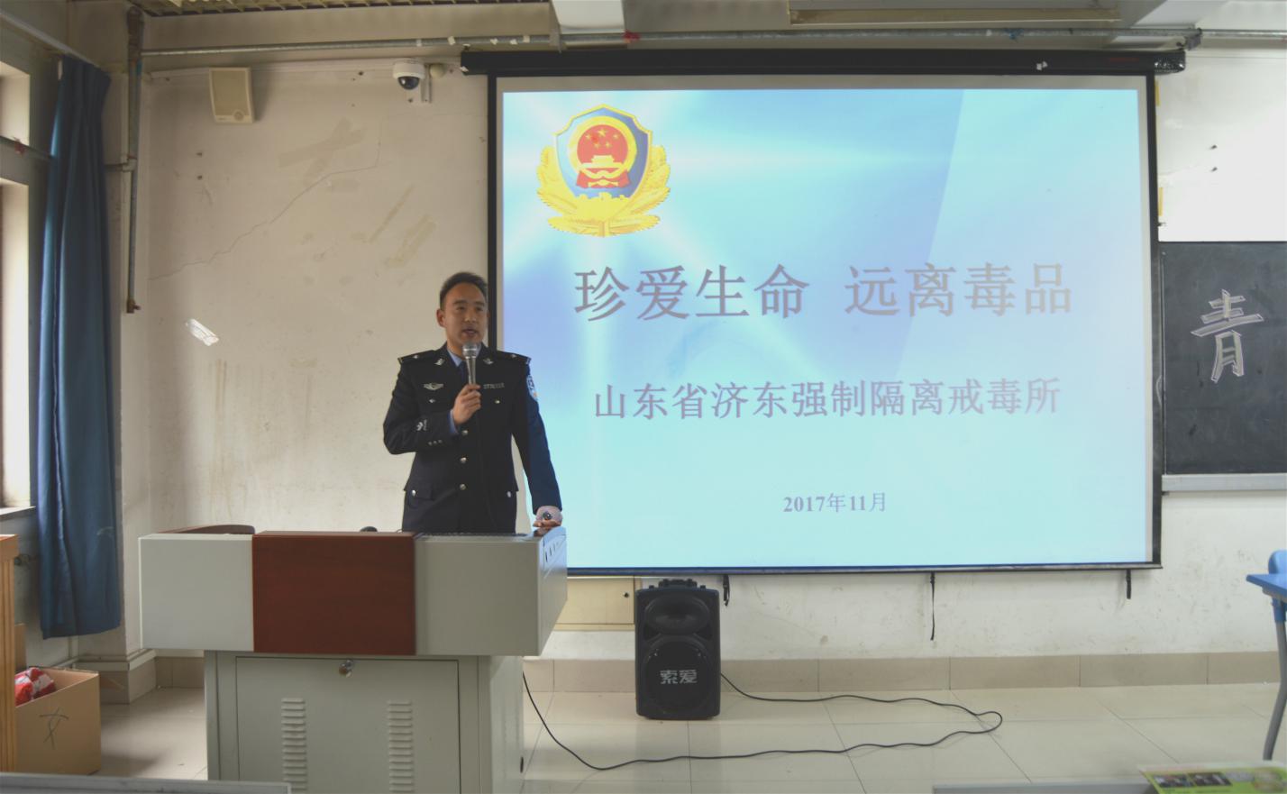 为进一步加强禁毒宣传教育,帮助大学生认清毒品危害,培养健康的生活、学习方式,打造文明校园,学校邀请山东省济东强制戒毒所政委张凯、警官王新江、李海龙做客学校青学讲堂开展禁毒宣教活动,来自全校的一百多名学生代表参加了此次活动。