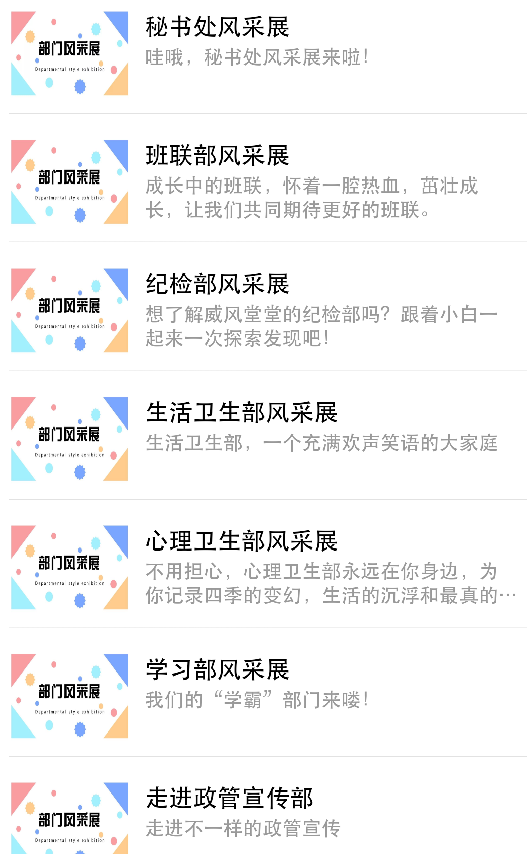 新的学期开始,为展现我院学生会良好风貌和工作成果,政治与公共管理学院网信部于2018年3月20日开始成功了举办“部门风采展”微信展示活动。