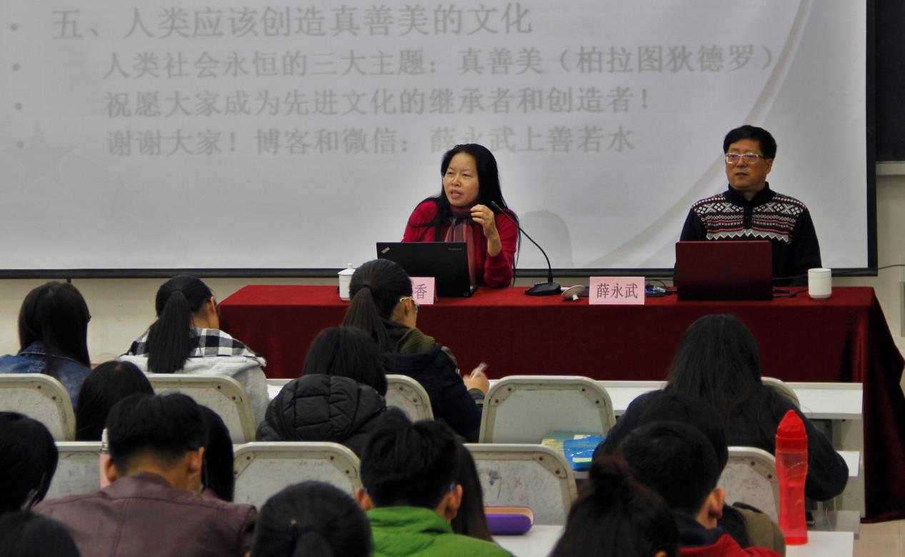 报告会上,薛永武教授围绕“文化的定义”、“从人的三种生命看文化对生命的塑造”、“国学与人生”、“西学与人生”、“人类应该创造真善美的文化”等五个方面展开报告会。他以没有文化的悲哀为出发点,密切联系实际,指出当代人基本文化素养缺失的现象。他认为人是最重要的文化形态,语言是思想文化的重要载体,世界观、人生观、价值观和思维方式等都属于文化要素,全面提升整体文化素质,不断强化文化战略,是向社会传播正能量的主要途径。他谈到,同学们应多学习古人们留下的国学精髓,注重肉体生命、精神生命、社会生命的有机结合。最后,他提出人类社会永恒的三大主题是真善美,鼓励同学们成为先进文化的继承者与创造者。报告会给现场同学带来了一场文化盛宴,让同学们领略了大师的风采。