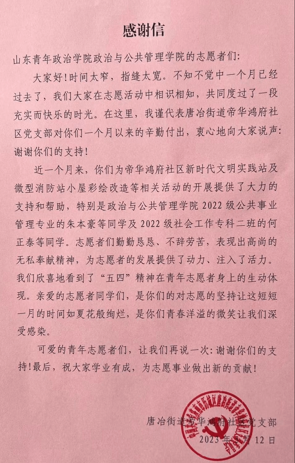 活动结束后,社区为志愿者们寄来了感谢信,这既是对志愿服务工作的肯定,也是对日后继续投身于志愿服务的激励。