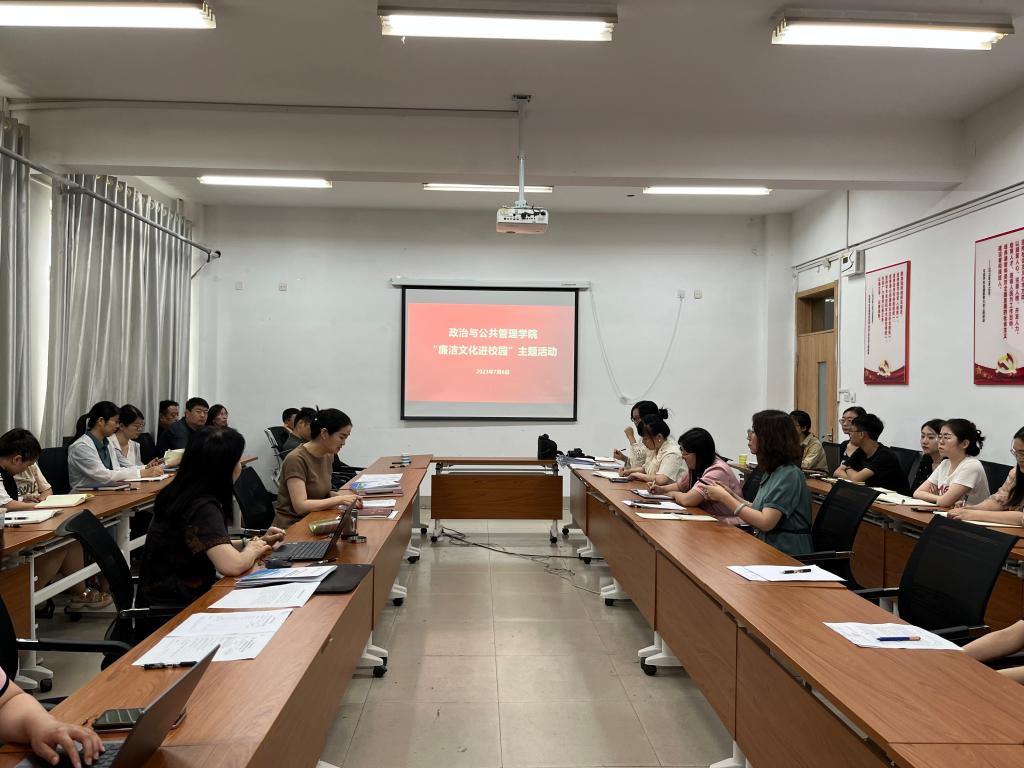 为深入学习宣传贯彻党的二十大精神,进一步推进廉洁政管建设,充分发挥廉洁文化的教育、示范、熏陶作用,7月6日下午,学院在敏行楼104会议室组织开展了“廉洁文化进校园”主题教育活动,本次活动由学院党委书记丁萍主持,全体教师参加。