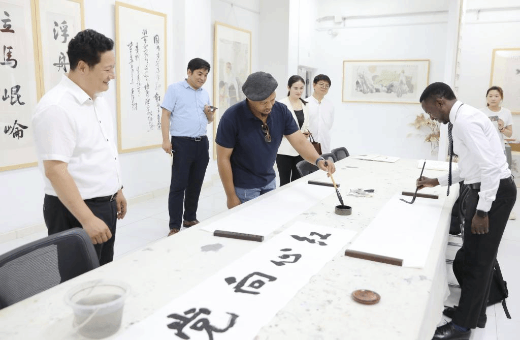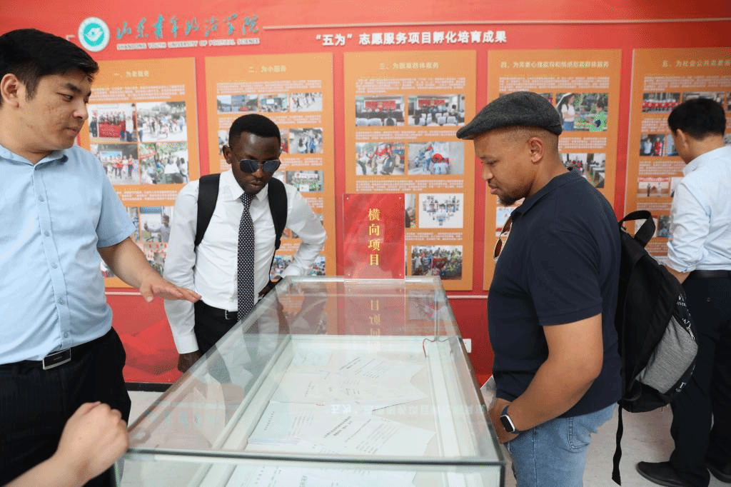 会前,马坦博一行来到我校山东省志愿服务研究基地,实地了解了基地建设、志愿服务体系内容,观看了我校青年志愿服务成果展。在设计艺术学院,马坦博一行还参访了中国传统书画工作室、纤维艺术与空间陈设工作室、中国民间非遗传统手工艺文创产品研发中心等多个具有中国传统文化特色的实验室和展厅。丰硕的学术成果和博大精深的中国传统文化让两位南非友人叹为观止,成熟的志愿服务研究与实务体系、传奇的鲁班锁和蜡染工艺、禅意十足的中国书画等都激发了来宾的浓厚兴趣,他们还在书法专业老师的指导下现场挥毫泼墨留下了中外合璧的书法作品。