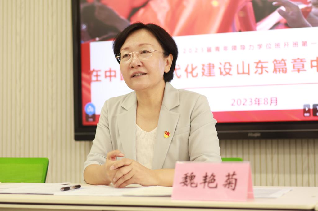 魏艳菊以“在中国式现代化建设山东篇章中贡献青春力量”为题向2023级青年领导力学位班学员讲授“开班第一课”。她围绕中国式现代化建设的理论创新与中国特色、在中国式现代化新征程中展现山东担当、在中国式现代化建设山东篇章中贡献青春力量三个方面展开阐述。她指出,党的二十大擘画了全面建成社会主义现代化强国、以中国式现代化全面推进中华民族伟大复兴的宏伟蓝图,吹响了奋进新征程的时代号角,而青年就是持续性推动中国式现代化发展的主力军与生力军。魏艳菊对学员们提出了殷切希望,她希望同学们铸就坚定的理想信念、培育高度的责任担当、磨炼坚韧的意志品格,在中国式现代化新征程上展现山东青年的担当,奋力谱写新时代社会主义现代化强省建设新篇章。