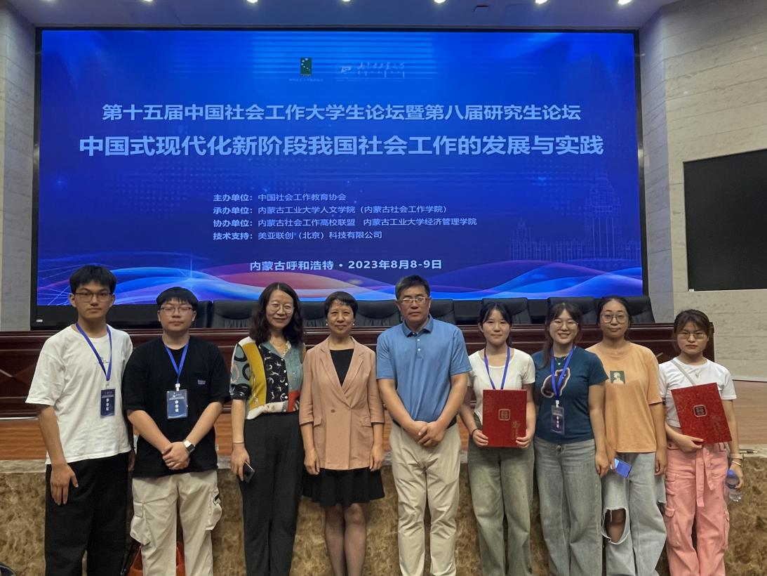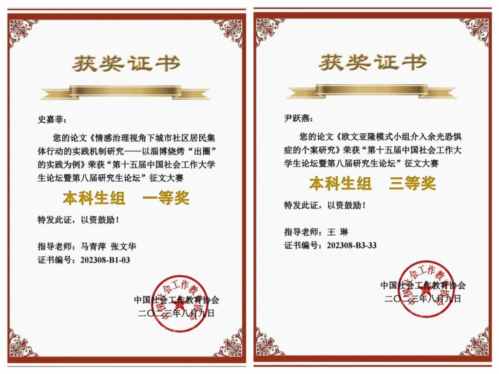 中国社会工作大学生论坛是目前国内社会工作领域最高水平的学生学术论坛,对强化社会工作专业学生的学术训练、促进社会工作人才培养、深化社会工作教育改革起到了重要引领作用。本届论坛主题为“中国式现代化新阶段我国社会工作的发展与实践”,来自清华大学、北京大学、南开大学等全国150余所高校、350余位师生参加本次论坛,是有史以来参与人数最多、规模最大的一届。我校史嘉菲撰写的论文《情感治理视角下城市社区居民集体行动的实践机制研究——以淄博烧烤“出圈”的实践为例》(指导老师:张文华和马青萍)荣获本科组一等奖;尹跃燕撰写的论文《欧文亚隆模式小组介入余光恐惧症的个案研究》(指导老师:王琳)获得本科组三等奖。