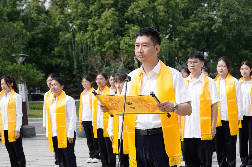 在大舜铜像祭舜仪式上,赵志刚宣读祭文,志愿者代表向大舜铜像敬献花篮,大家佩戴黄色绶带,静立默哀,向中华道德文化的始祖大舜致敬鞠躬。