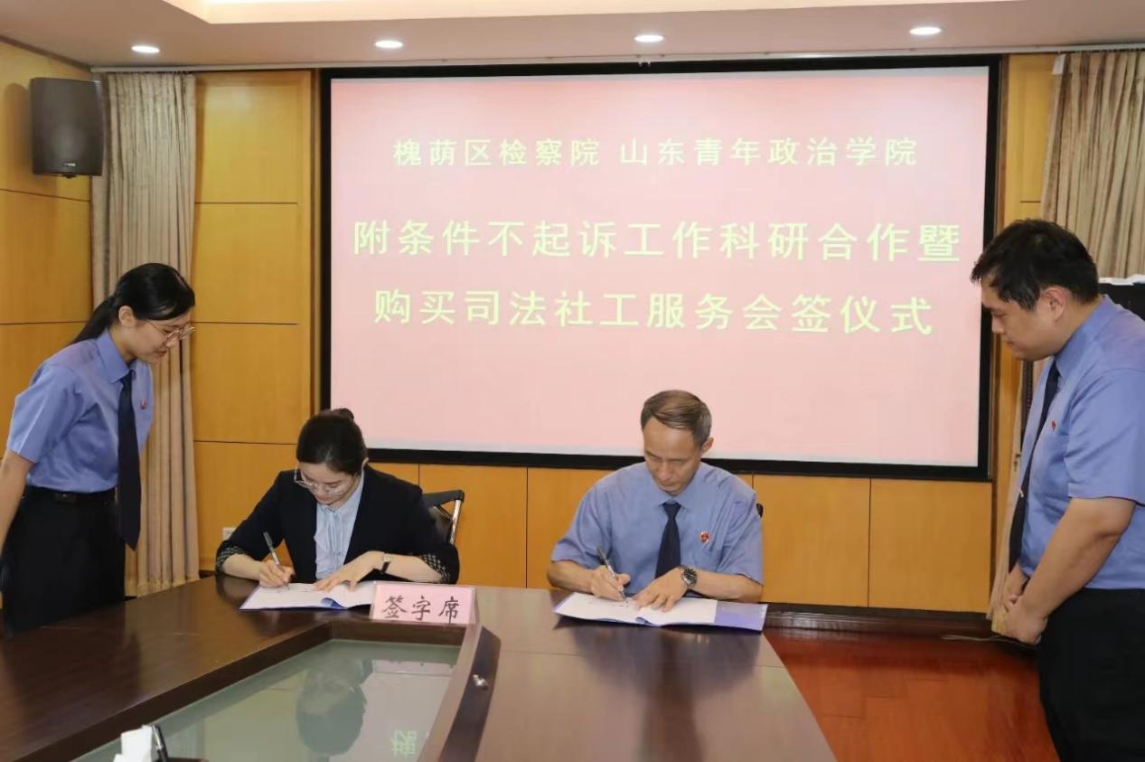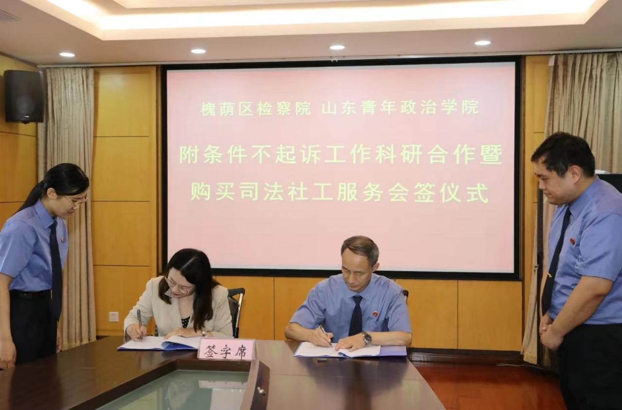 9月28日上午,我校与济南市槐荫区检察院举行附条件不起诉工作科研合作暨购买司法社工服务会签仪式。槐荫区检察院党组副书记、副检察长王泳淳,我校党委委员、组织部长、政治与公共管理学院党委书记丁萍出席签约仪式并代表双方签约,槐荫区检察院检委会专职委员王飞及第三检察部干警,我校科研处副处长梁艳,政治与公共管理学院副院长卢鹏程,济南山青社会工作服务中心副总干事王晓恬参加仪式,仪式在槐荫区检察院举行。仪式前,槐荫区检察院党组书记、检察长王海龙与丁萍一行进行了工作会谈。
