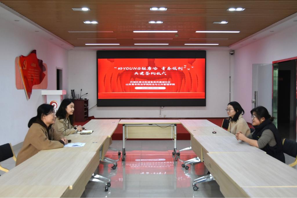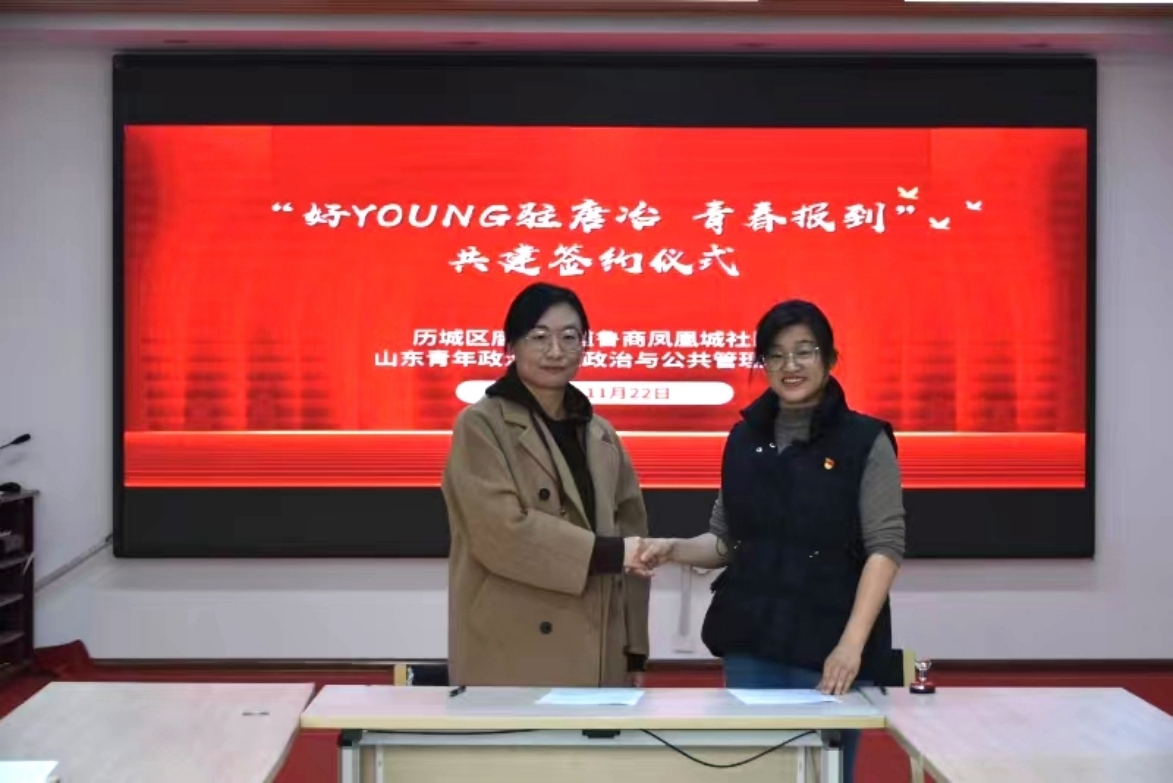 为贯彻执行团省委、省教育厅联合印发的《关于开展“百万大学生进社区”社会实践的工作方案》,充分发挥实践育人作用,政治与公共管理学院积极与驻地社区联系,推动学生社团、团支部与街道社区结对,11月22日,学院与历城区唐治街道鲁商凤凰城社区举行共建签约仪式,学院团总支书记庞翠、辅导员王婧参加本次签约仪式。