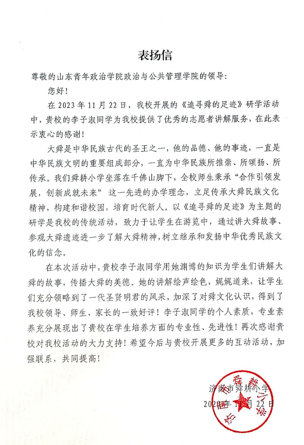 近日,政治与公共管理学院收到了济南市舜耕小学发来的表扬信,信中对我院大舜文化志愿宣讲团志愿者李子淑同学提出表扬:“李子淑同学在本次活动中,用渊博的知识为学生们讲解大舜的故事,传播大舜的美德。她的讲解绘声绘色,娓娓道来,让学生们充分领略到了一代圣贤明君的风采,加深了对舜文化认识,得到了我校领导、师生、家长的一致好评!”