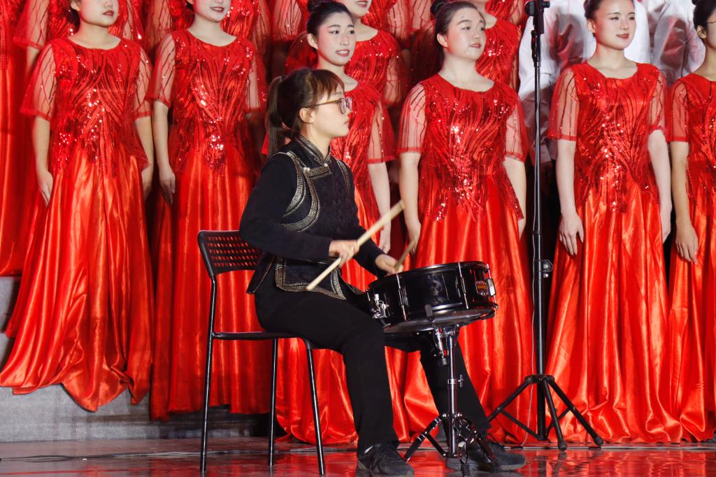本次比赛筹备历时两月有余,合唱团、舞蹈队80余名师生大胆创新,融入舞蹈、军鼓等元素,在每日两个多小时的重复训练中,反复回看排练视频,臻于至善、打磨细节。合唱团负责人王琴琴感慨到:“从大一参加比赛,到大三统筹团队比赛,不仅提升了我对音乐和团队精神的理解,角色、任务的转变也让我的个人能力有了进一步的提高。每一次排练,都让我明白,只有团结一致,才能战胜困难,实现我们的目标和梦想。”80多天的排练,成员们在不断的交流与碰撞中沉下心、扑下身、扎下根,师生携手同舟共济,牢记初心踵事增华。