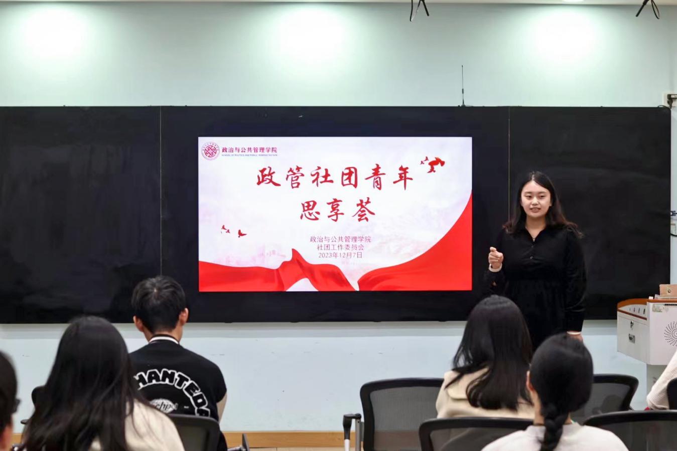为提高学生社团参与学科竞赛的积极性,培养社团青年的科学素养和创新能力,12月7日下午,政治与公共管理学院第三期社团青年“思享荟”在社工实验室小组室召开。本次会议由大舜文化志愿宣讲团代表马睿哲作分享,辅导员王婧、各社团代表参加。