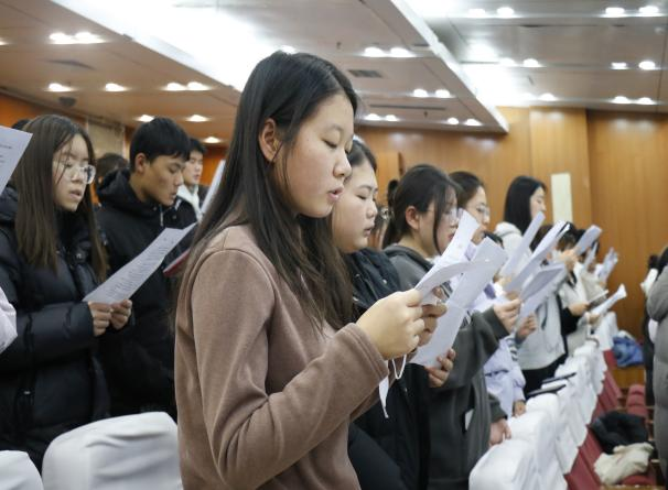 为加强宪法宣传工作,助力学校宪法宣传周活动开好头、起好步,12月4日,由学校团委主办、学院法律协会承办的“宪法晨读”活动在图书馆学术报告厅举行。本次活动采取转播方式进行,通过普法网同步连线教育部在北京设立的“宪法晨读”活动主会场,同步同频跟随主会场流程开展活动。活动中各学院参会学生共同参与升旗仪式,齐心诵读宪法条款,合力传唱宪法歌曲,一同观看优秀展演,认真聆听领导讲话,以青春力量传奏了尊崇宪法、弘扬宪法的法治之声。