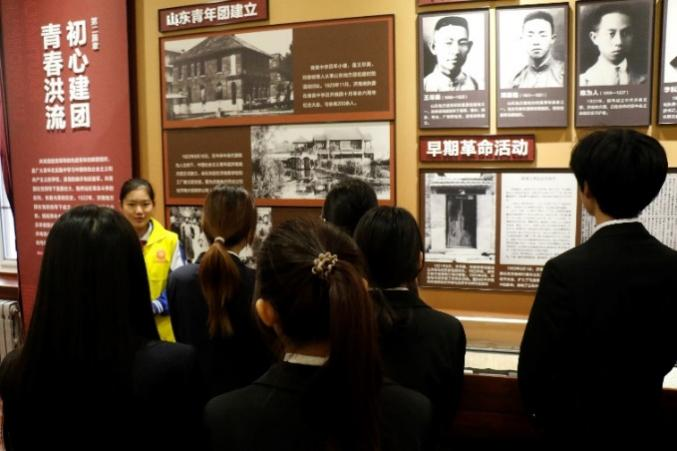 新发展团员来到济南育英中学,在育英尽美志愿服务队学生志愿者的带领下有序参观山东建团纪念馆。穿过一楼的走廊,沿百年木质楼梯拾级而上。五位讲解员以时间为线索,为全体团员介绍了《苦难中国,真理探索》《初心建团,青春洪流》《腥风血雨,踏血前行》《抗日救亡,旌旗漫卷》《民族解放,走在前列》五个篇章。通过30多位青年的事迹,无数个历史瞬间,回顾了山东建团那段艰苦卓绝的历程,系统展现了山东地方团组织由弱小变强大,从九死一生到蓬勃兴盛的革命史诗。新发展团员青年代表认真听取讲解,在历史文物前纷纷驻足观看,真切感受山东共青团在党的领导下走过的光辉历程。学习结束后,新团员在纪念馆内举行了庄严的入团仪式。