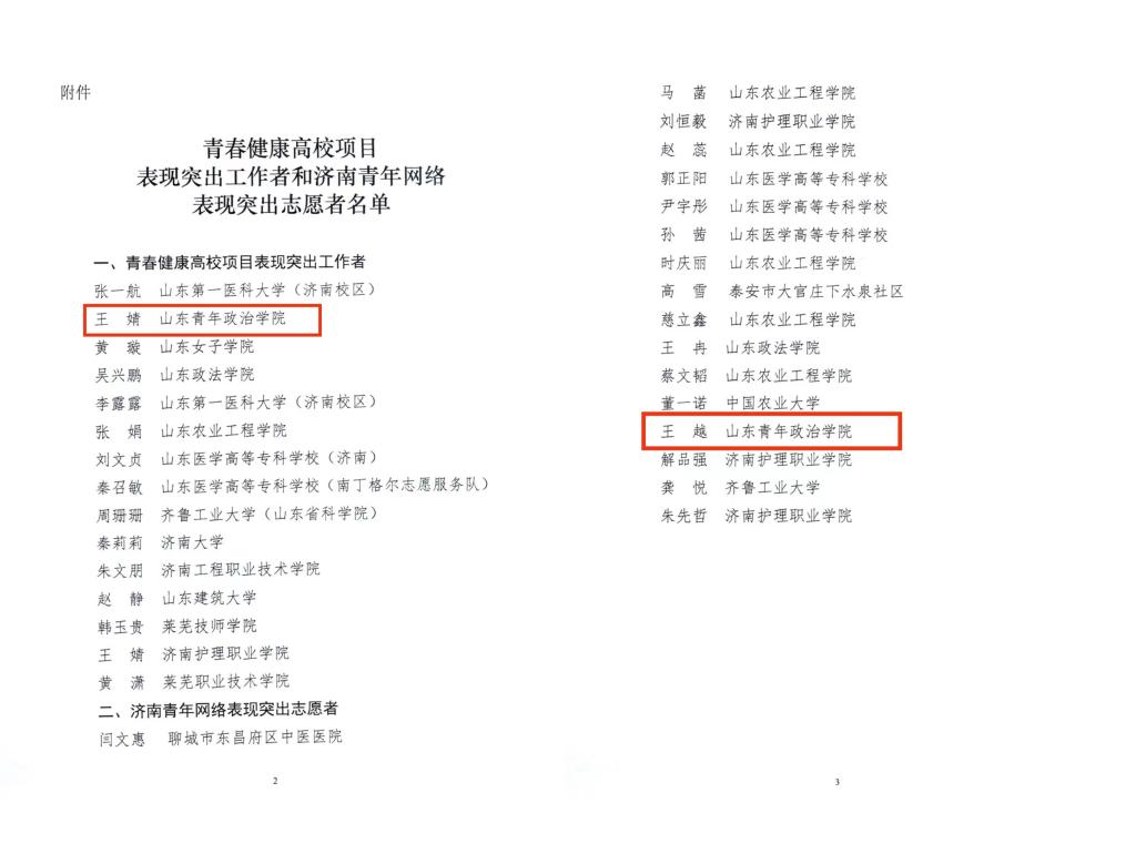 近日,政治与公共管理学院收到了济南市计划生育协会发来的表扬信,信中对我院辅导员王婧及晨之曦社工协会学生负责人王越提出表扬。其中王婧作为我校中国计划生育协会青春健康高校项目的项目指导教师,被评为“青春健康高校项目表现突出工作者”,王越作为学生志愿者积极参与开展青春健康教育工作,普及青少年性与生殖健康知识,被评为“济南青年网络表现突出志愿者”。