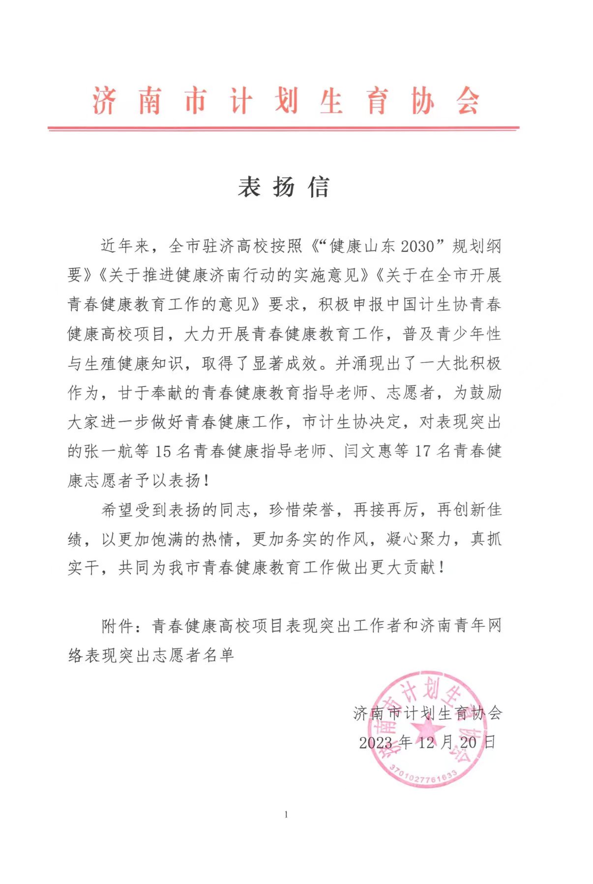济南市计划生育协会的表扬信,不仅是对我校开展青春健康教育工作的认可,更是对学院老师、志愿者开展高校青春健康教育工作的肯定与支持。接下来,学院将继续以开展青春健康教育项目为载体,积极推进与济南市计划生育协会、济南青年网络和驻济项目点高校的合作,形成青春健康教育工作的整体合力,不断提升在青春健康领域对青少年服务的专业指导技能,为广大青少年的健康成长保驾护航,为实现健康中国战略贡献青春力量。