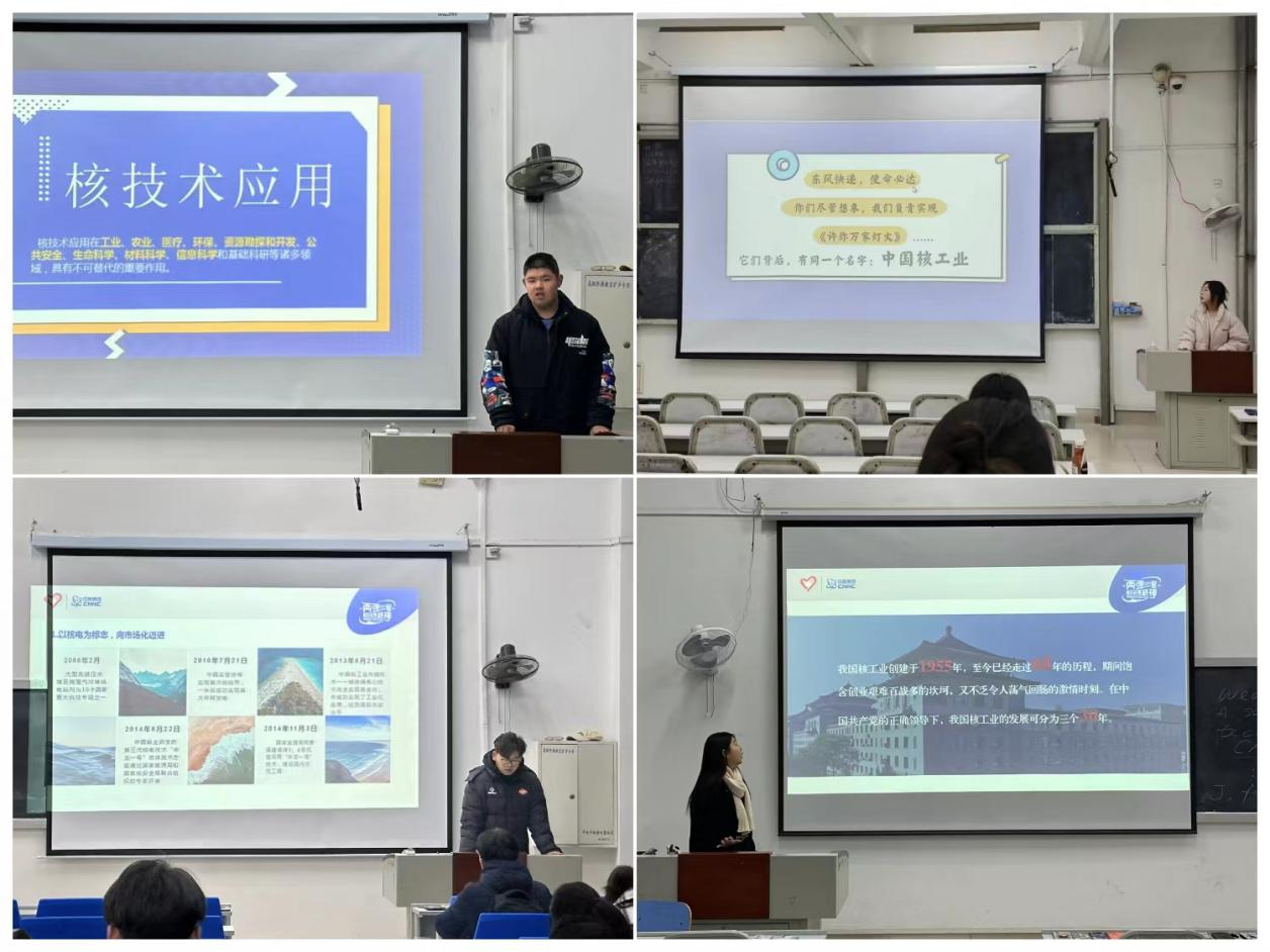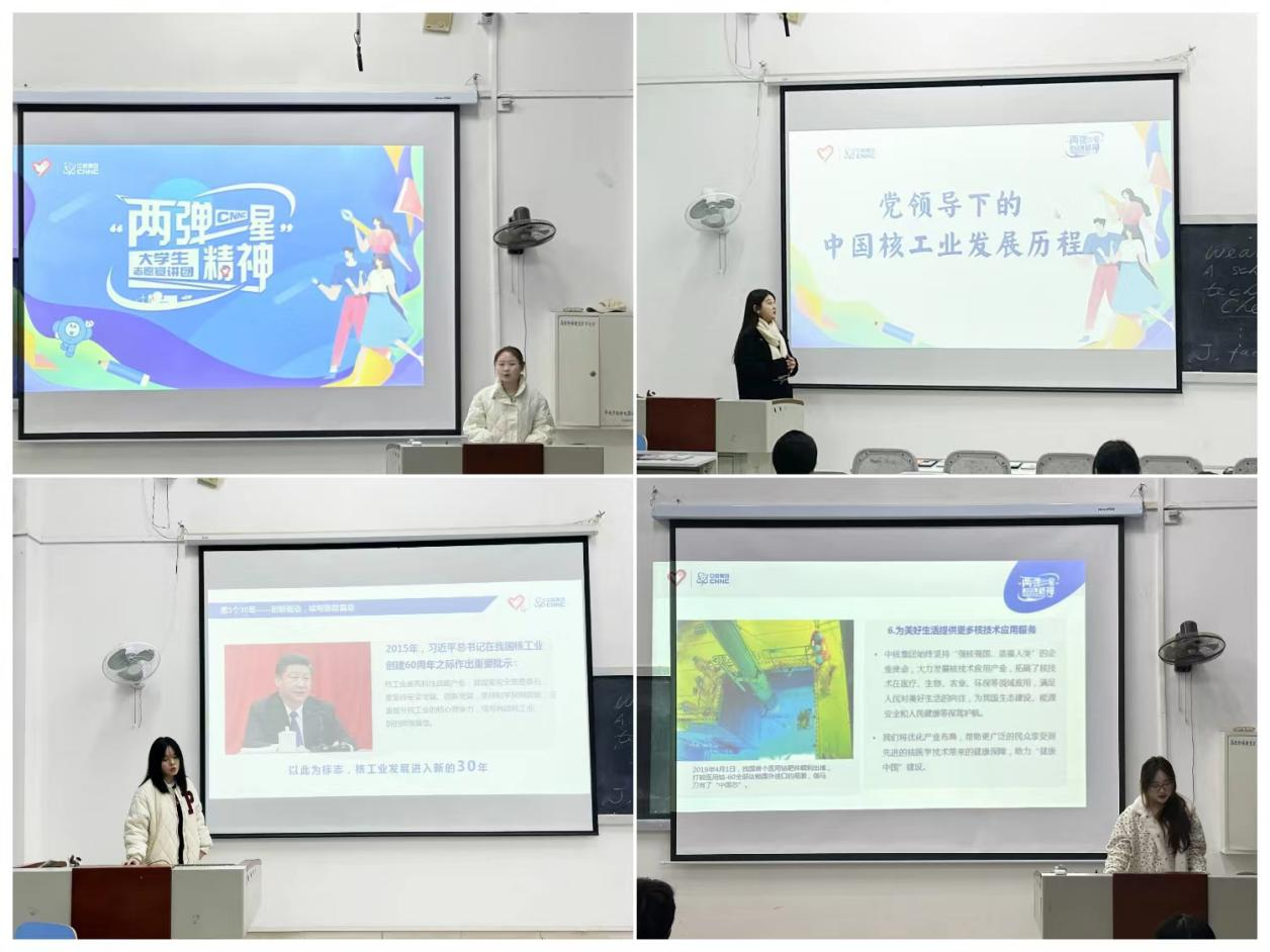“两弹一星”精神作为中国共产党人精神谱系的重要组成部分,是一代代科研工作者用生命和心血铸成的精神丰碑,也是中华民族宝贵的精神财富。宣讲过程中,宣讲团志愿者们运用精炼的语言、生动的案例、丰富的史料,从发展历程、主要内容、时代价值三个方面生动阐述了“两弹一星”精神,详细介绍了钱三强、钱学森、邓稼先、于敏等“两弹一星”元勋的光辉事迹,系统回顾了我国核工业走过的68年辉煌历程。活动最后,志愿者们呼吁同学们要继承优良传统、学习先辈榜样,大力弘扬和践行“热爱祖国、无私奉献,自力更生、艰苦奋斗,大力协同、勇于登攀”的“两弹一星”精神,努力成为有理想、敢担当、能吃苦、肯奋斗的新时代好青年。