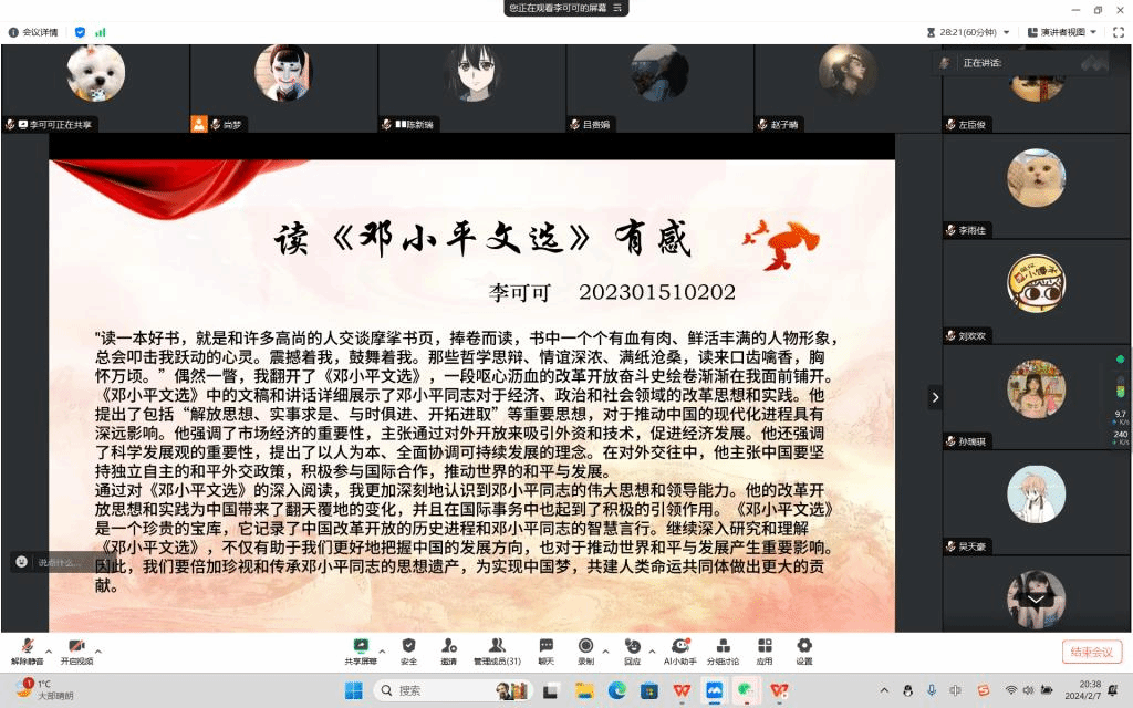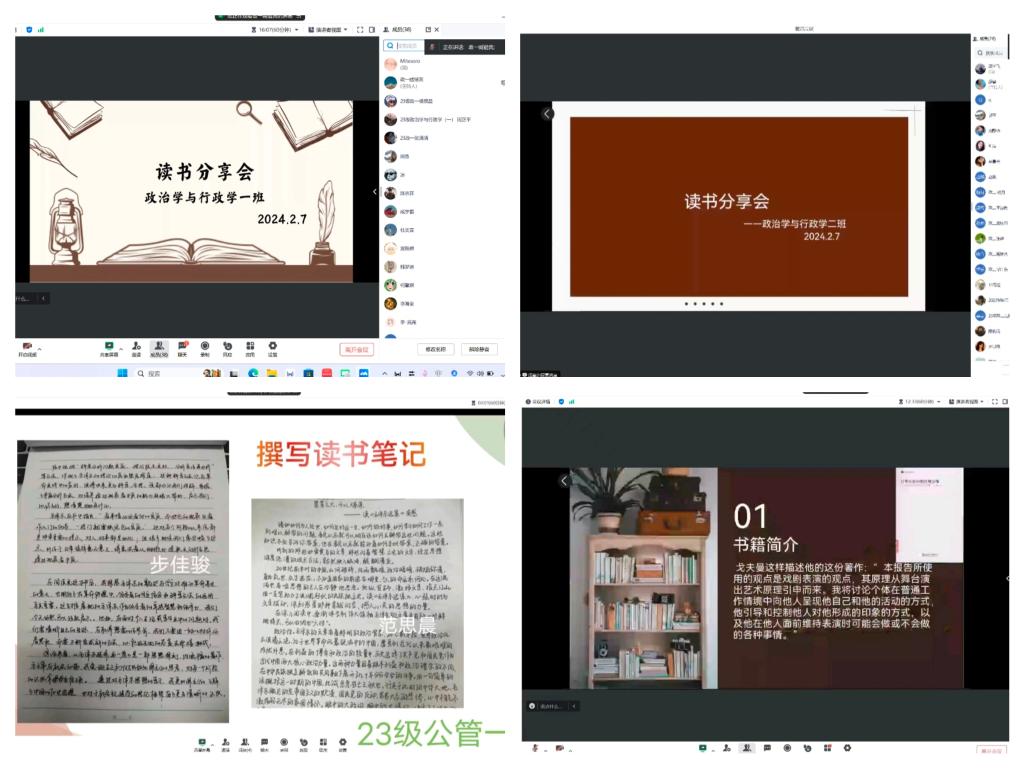 为持续推进“精读一部名著典籍”读书活动,点燃同学们的阅读热情,提升新时代青年的知识文化修养,拓宽知识面。寒假期间,政治与公共管理学院组织开展“书香沁新年,‘悦’读越有福”班级线上读书交流会。本次活动由各班班长主持,2023级全体新生参与此次活动。