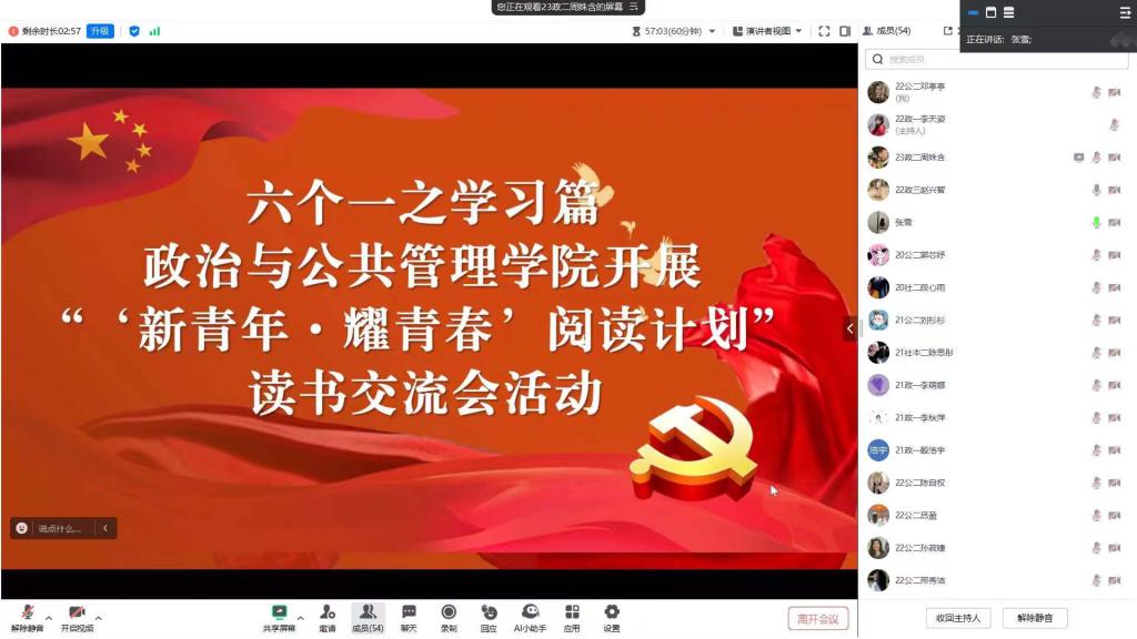 为引导激励广大学生爱读书、读好书、善读书,进一步推动“精读一部名著典籍”读书活动走深落实,加强对新发展党员和新发展团员的教育培养,2月20日,政治与公共管理学院开展“‘新青年·耀青春’阅读计划”读书交流会活动。本次读书会由辅导员张雪主持,学院2023年新发展党员和团员参与此次活动。