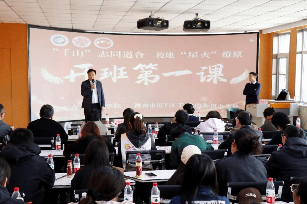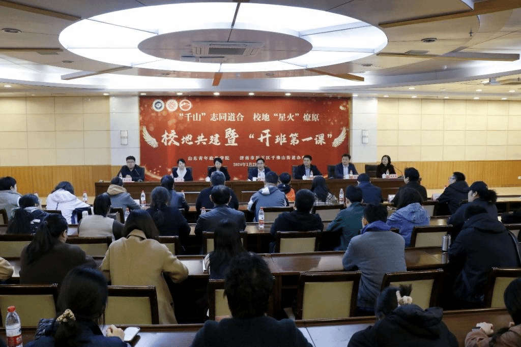 3月28日,山东青年政治学院与济南市历下区千佛山街道办事处2024年校地共建揭牌暨签约仪式顺利举行。学院党委委员、副院长陈龙溪,千佛山街道党工委书记张保国,学院政治与公共管理学院院长王玉香、党委书记王正坤以及来自千佛山街道各科室、社区的社区工作人员、网格员等60余人参加。