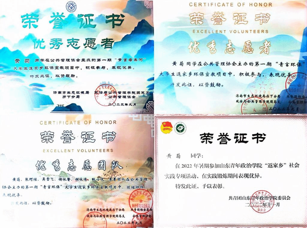 春风万丈惊蛰来,青春当属志愿红。在追“锋”的旅途中,黄菊积极投身志愿服务活动,用行动担当青年责任。在公共管理协会举办的“青言环保”大学生返家乡环保宣教项目启动仪式上,黄菊带领志愿者为家乡的儿童带来一堂堂生动有趣的环保课,助力营造家乡良好的生态文明氛围;在“青言母亲河”大学生返家乡环保宣教项目中,黄菊化身黄河卫士,积极开展环保宣讲,呼吁大家合理用水,保护黄河生态;在“传承大舜精神,传播节水理念”主题活动中,黄菊作为志愿者分享节水知识,用实际行动践行“珍惜水、节约水、爱护水”生态文明理念;在暑期第二课堂活动中,黄菊耐心向孩子们科普野生动物保护知识和相关法律法规,带领孩子们正确认识生物多样性的重要意义,引导孩子们树立野生动物保护理念。