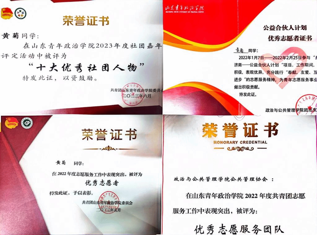 黄菊,2021级公共事业管理专业学生,中共预备党员,第九届公共管理协会会长,2022级新生助理辅导员,政治与公共管理学院辩论队副队长,连续两年荣获校级奖学金。在校期间她认真学习、刻苦努力,积极参与学生工作和志愿服务活动,取得了优异成绩:作为项目负责人主持校级挑战杯一项并获一等奖;参与校级大学生创新创业项目两项;积极参与清洁美丽中国行活动,所申报项目先后入选2022年清洁美丽中国行鼓励名单和2023年清洁美丽中国行资助项目名单;参与“身边的济南——公益合伙人计划”项目、“返家乡”社会实践专项活动、“青言环保”大学生返家乡环保宣教项目等志愿服务活动,多次获得“优秀志愿者”和“优秀组织者”等荣誉称号。