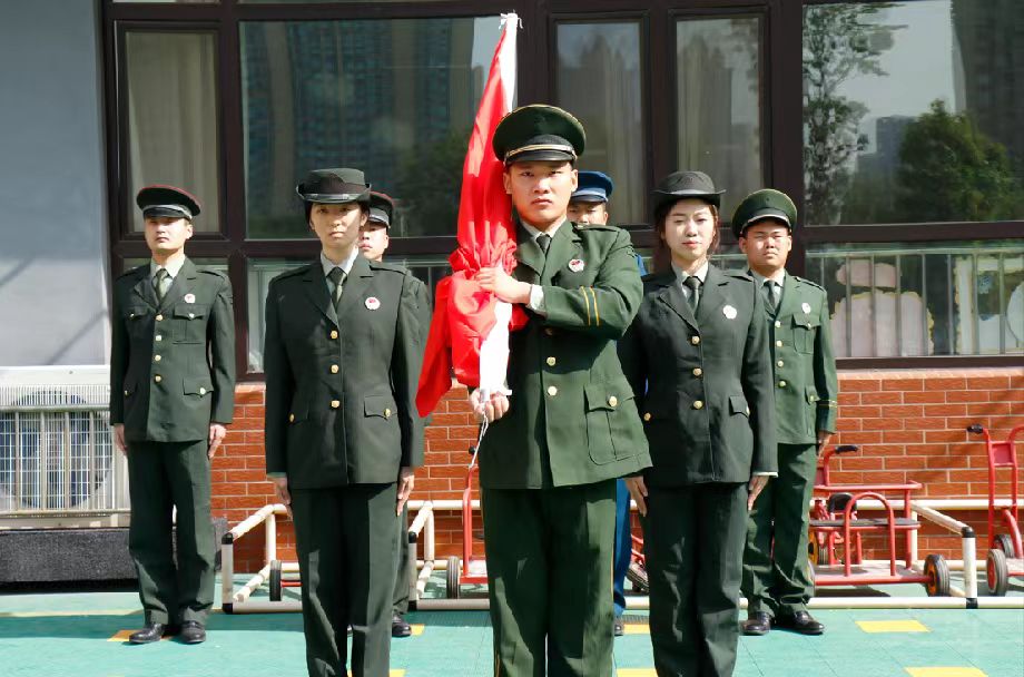 由退役大学生士兵组成的国旗护卫队为幼儿园孩子们带来了一场特别的升旗仪式。伴随着激昂的《义勇军进行曲》,五星红旗冉冉升起,孩子们抬头望着升起的国旗,每一个专注的目光,都饱含着大家对祖国无限的热爱。