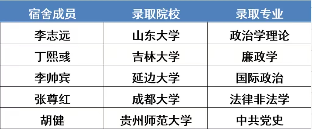 追风赶月莫停留,平芜尽处是春山!随着2024年全国硕士研究生招生考试落下帷幕,政治与公共管理学院3307的男生宿舍捷报频传——宿舍6名同学考研,实现全员上岸。在考研这条赛道上,为自己的青春交上了一份满意的答卷。今天,让我们来一起认识下这个“学霸宿舍”吧!