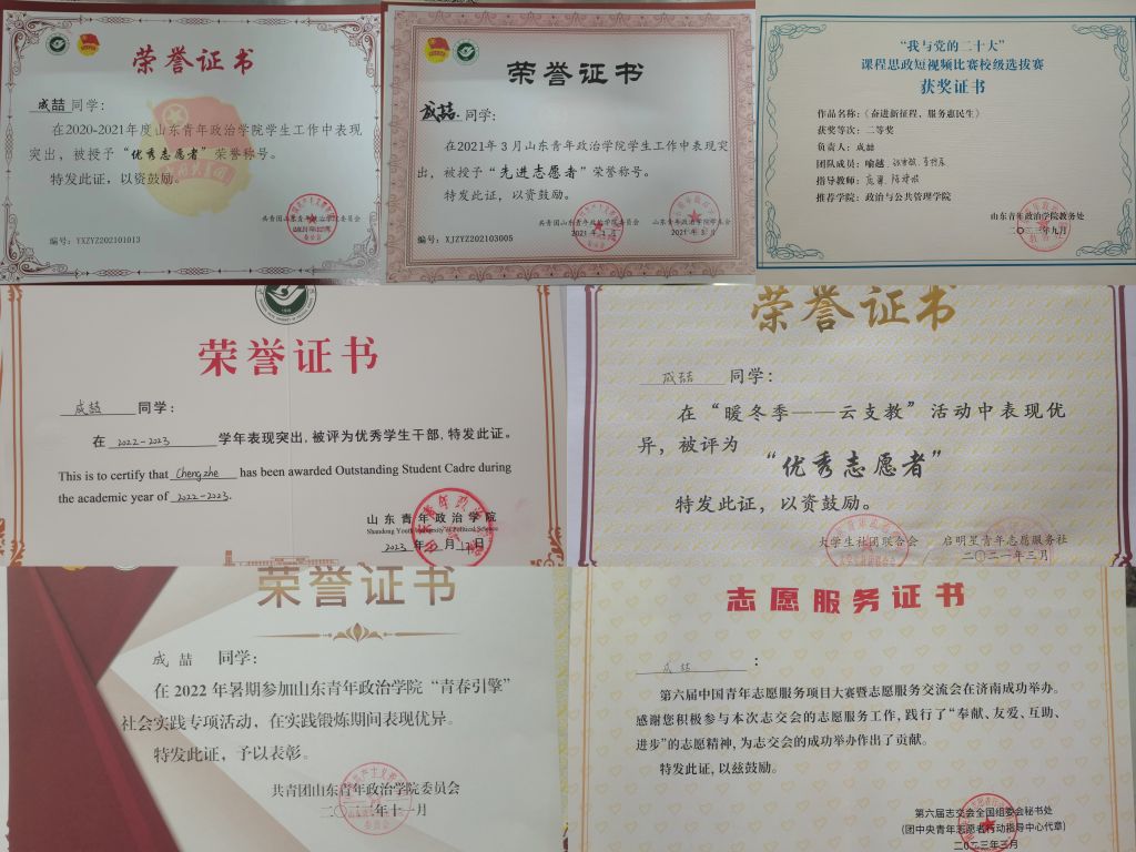 2020-2021年度、2021-2022年度三等优秀学生奖学金;