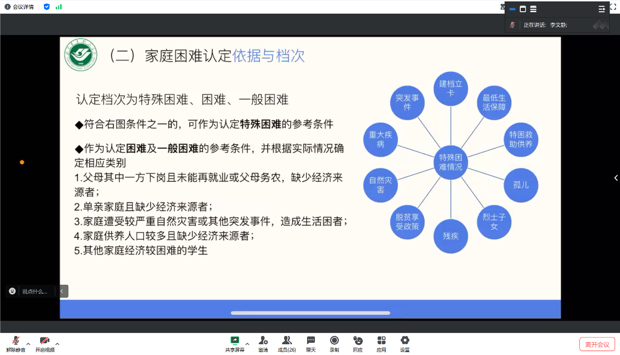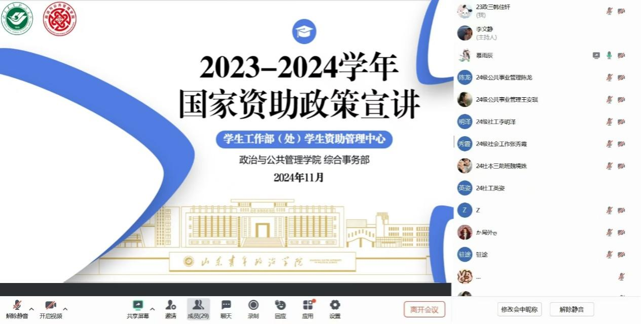 为深化2024级学生对学校资助政策的了解,充分解决家庭经济困难学生求学的后顾之忧,11月22日,政治与公共管理学院面向全体2024级学生开展资助政策线上宣讲会。本次宣讲会由学院综合事务部组织开展。