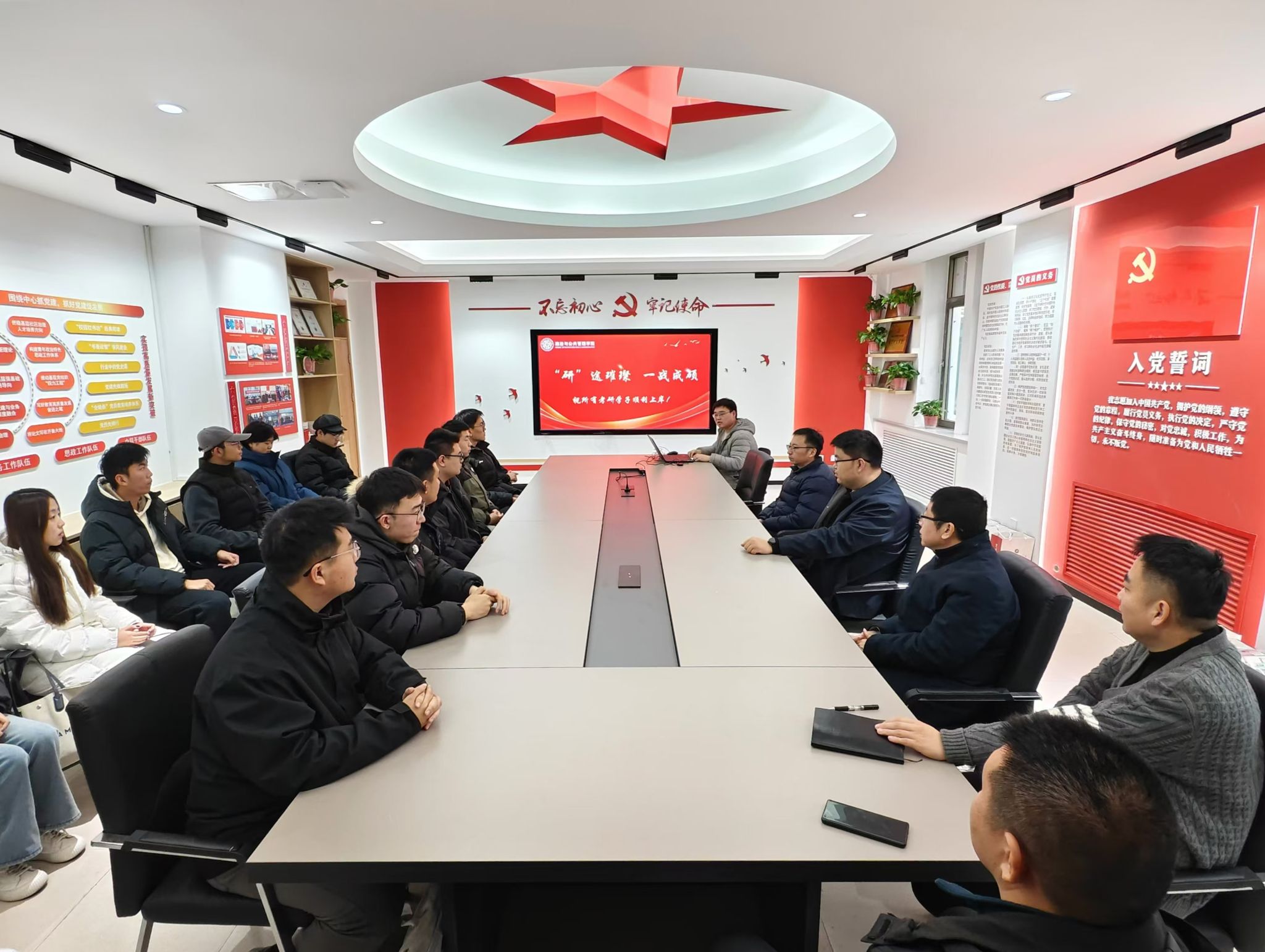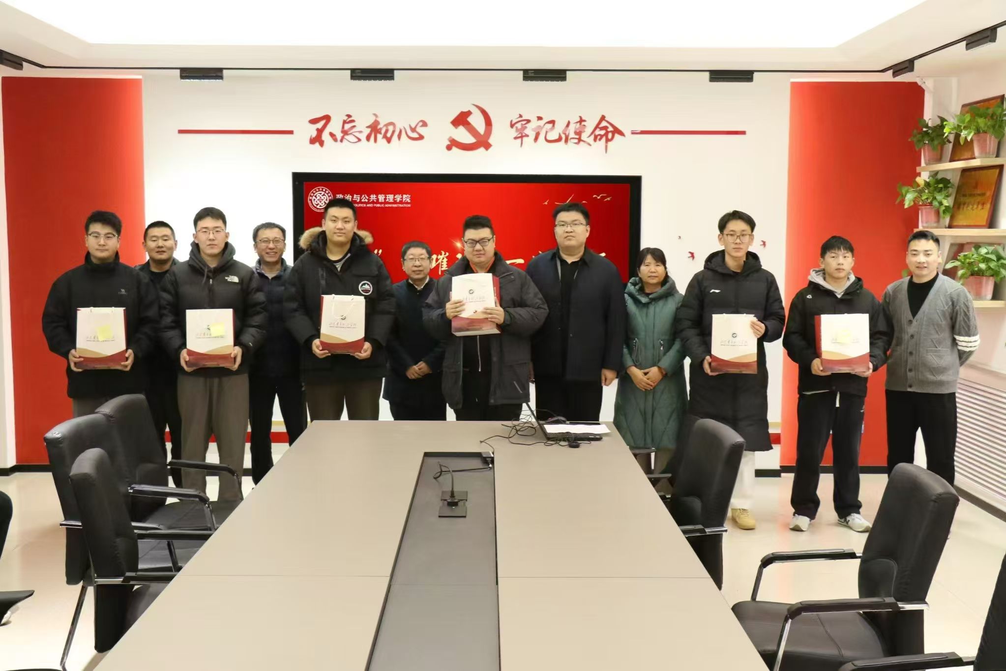 在2025年全国硕士研究生招生考试来临之际,为帮助考研学生坚定考试信心、舒缓考试压力、铸就必胜信念,12月11日,政治与公共管理学院于敏行楼103室精心策划开展“‘研’途璀璨,一战成硕”考研暖心助力活动。学院党委书记王正坤,副院长张剑、卢鹏程以及部分教师代表参加活动,亲切慰问考研学子并赠送考研礼包,为同学们加油鼓劲。