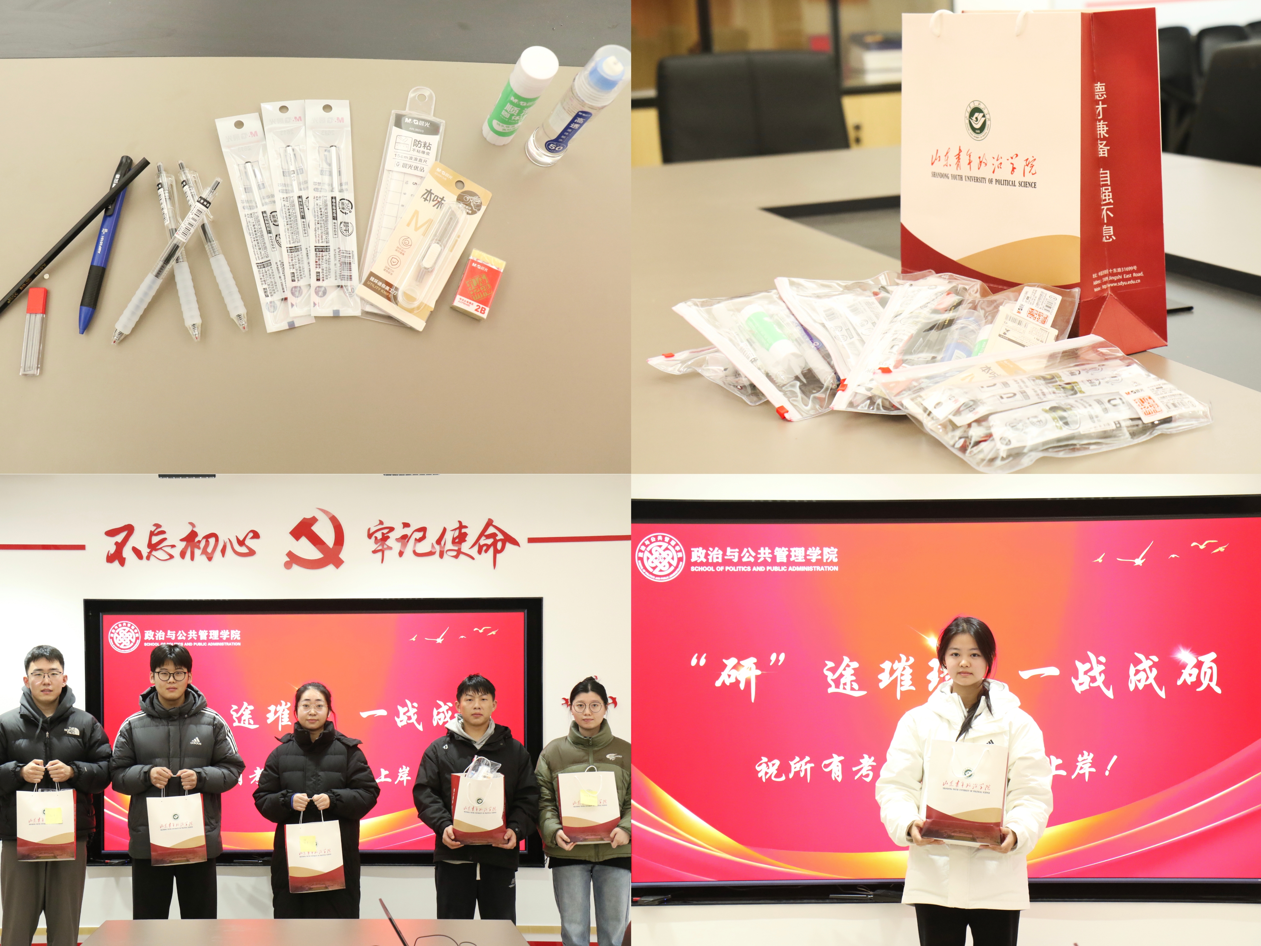 学院为考研学子精心准备“考研助力礼包”。礼包内含黑色中性笔、自动铅笔、橡皮、胶棒、美工刀以及多功能答题套尺等各种考研实用文具。每一份礼包都承载着学院对学生的殷切期望与美好祝愿。现场学生纷纷表示,一定会携着学院的关怀与祝福,奋勇争先、努力向前,以昂扬的精神状态和奋斗姿态全力应对考试,用卓越的成绩回馈来自学院与家人的厚望与期待。