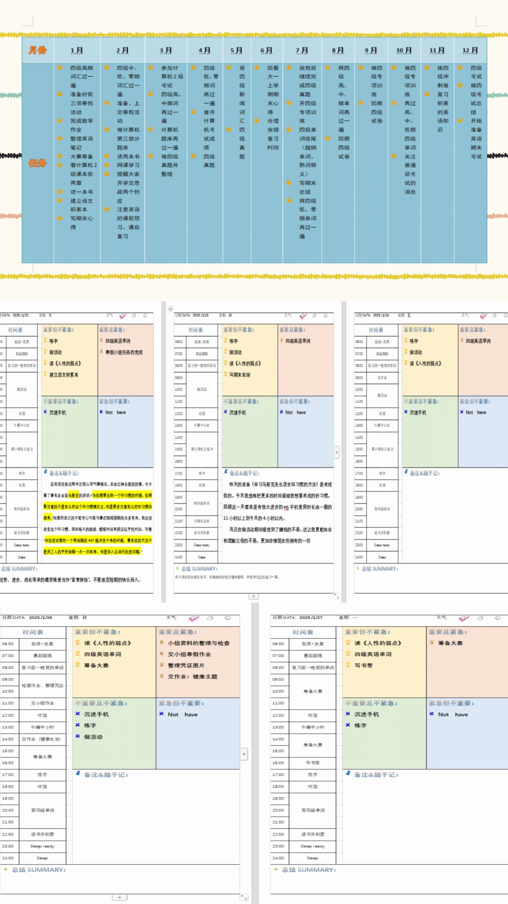 计划介绍:我的2025年学习计划主要是针对自己在学习上的短板进行弥补和针对自己未来的人生目标需要的考试进行准备。首先要明白自己的未来理想;其次,根据理想要求与实际进行联系,找出2025年必须要完成的几个主要大任务;再次,将年计划细分到每个月,养成持续学习的习惯;最后,再将宏观的计划细分到每一周、每一天。这样制定计划可以以年、月、周为时间节点及记录自己的成长,更清晰地看到自己的进步,路漫漫其修远兮,完成人生大理想,让我们从点滴做起!