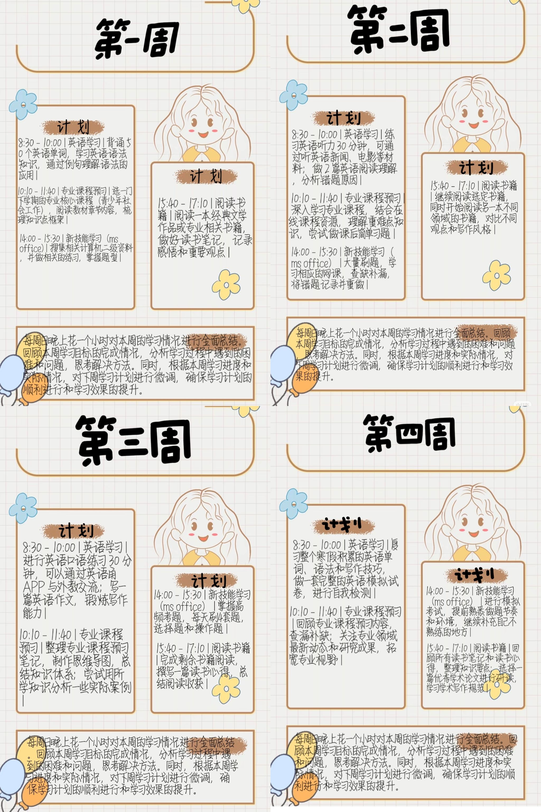 计划介绍:我的四周学习计划涵盖了英语学习的词汇积累与语法掌握,专业课程的预习以及经典文学与专业书籍的阅读。此外,我还安排了新技能的学习,准备计算机二级的考试。每周日晚上,我会对本周学习进行总结,回顾目标完成情况,分析遇到的问题,并思考解决方法。同时,根据学习进度和实际情况,对下周计划进行微调,确保计划的顺利进行和学习效果的提升。这份计划让我更有条理地进行学习,也使我更加自律和专注。
