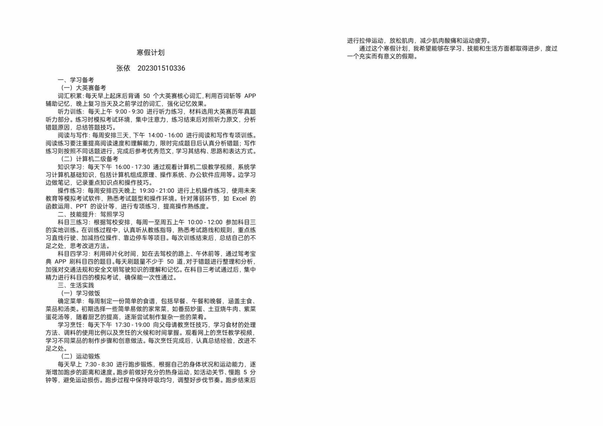 计划介绍:在学习上,兼顾大英赛与计算机二级备考,从词汇、听力、阅读写作到计算机知识与操作,合理安排时间巩固提升。技能培养方面,按驾校安排练科目三,利用碎片时间学科目四,争取拿下驾照。生活实践中,学习做饭提升生活技能,每天跑步锻炼保持健康。通过这份计划,我期望在寒假实现全方位成长,提升知识储备与技能水平,以更自信的姿态迎接未来,为新学期和今后的发展打下坚实基础,度过充实且有意义的假期。