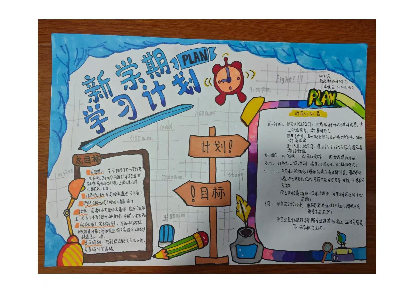 为帮助同学们更好地规划新学期学习生活,养成良好的学习习惯,提高学习效率,政治与公共管理学院开展了“博学笃行逐梦,巧学善思启航”制定新学期学习计划活动。活动得到了同学们的积极响应,涌现出一批优秀的学习计划作品。同学们聚焦专业学习、学术科研、考级考证、升学就业等任务,深入思考,制定目标,超前谋划,落实行动。让我们一起来看看各位同学的优秀作品吧!