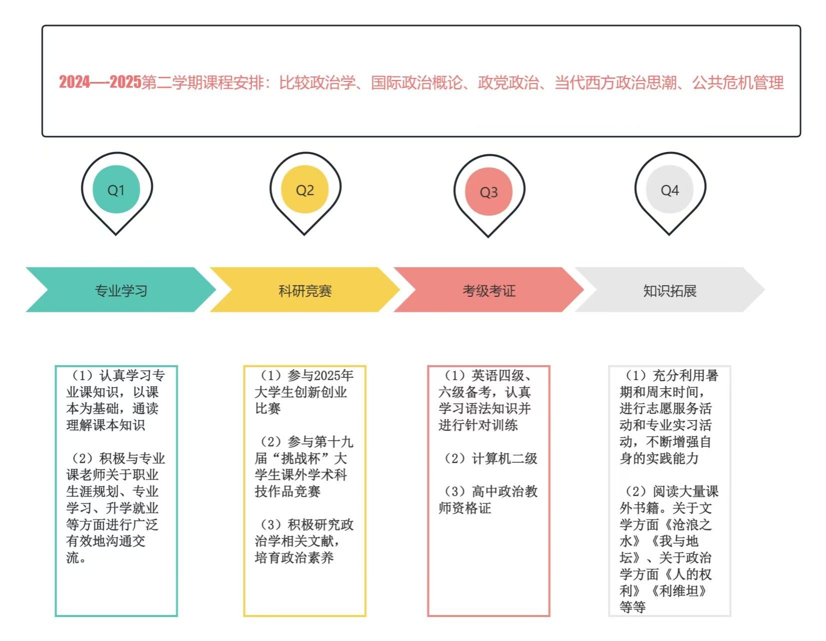 计划介绍:该计划从专业课程安排和能力培养两方面展开。首先,本学期安排了适量的专业课程,踏实积极地学习有利于提高自身政治学的专业知识能力、夯实基础。其次,能力培养主要从专业学习、科研竞赛、考级考证、知识拓展四个方面进行安排,每个方面作出具体计划安排,有效正确地发挥主观能动性,充实生活,发展自我,实现自我价值与社会价值的相统一。