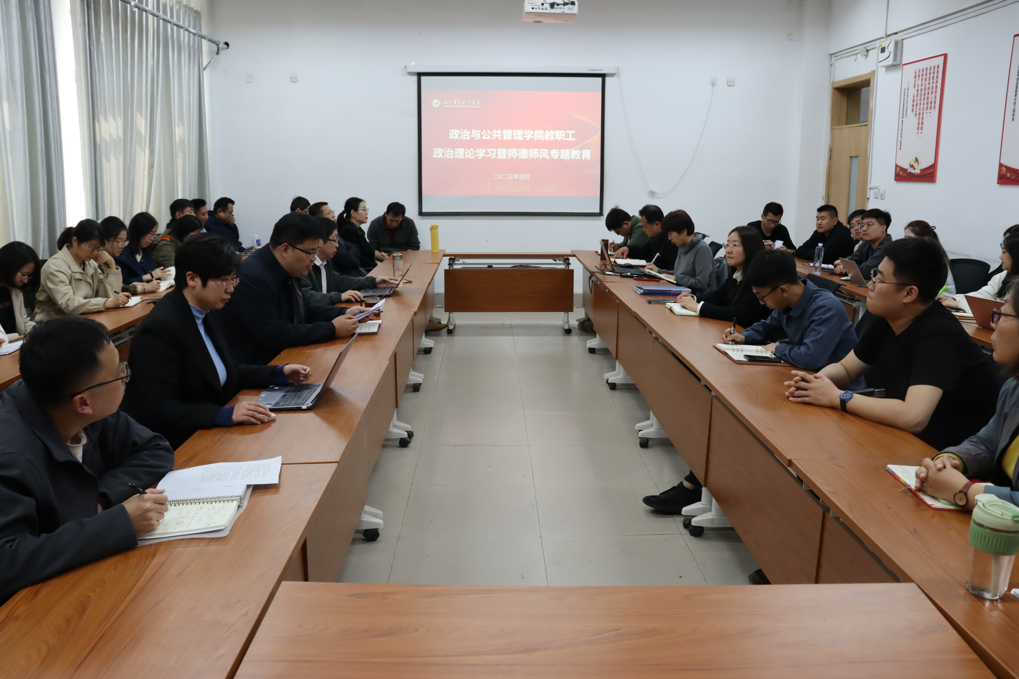 4月10日,政治与公共管理学院在敏行104会议室召开教职工政治理论学习暨师德师风专题教育,学院党委书记王正坤主持并领学,全体教师参会。