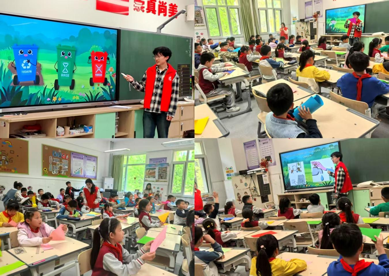 活动过程中,志愿者们用通俗易懂的语言和精美有趣的图片,分别向小朋友们讲解绿色低碳知识,分享减碳日常生活小妙招。“喝完的矿泉水瓶能变成花盆吗?”“旧报纸如何变身收纳盒?”志愿者们与小朋友们开展课堂互动,用贴近生活的案例来引导孩子们发散思维,思考旧物再利用的可能性。在手工实践环节,废旧矿泉水瓶装饰、废旧纸再利用等环保再利用手工活动使小朋友们在动手实践中切身学习到了绿色低碳生活知识,在体验、感受旧物利用魅力的同时,增强了环保意识。