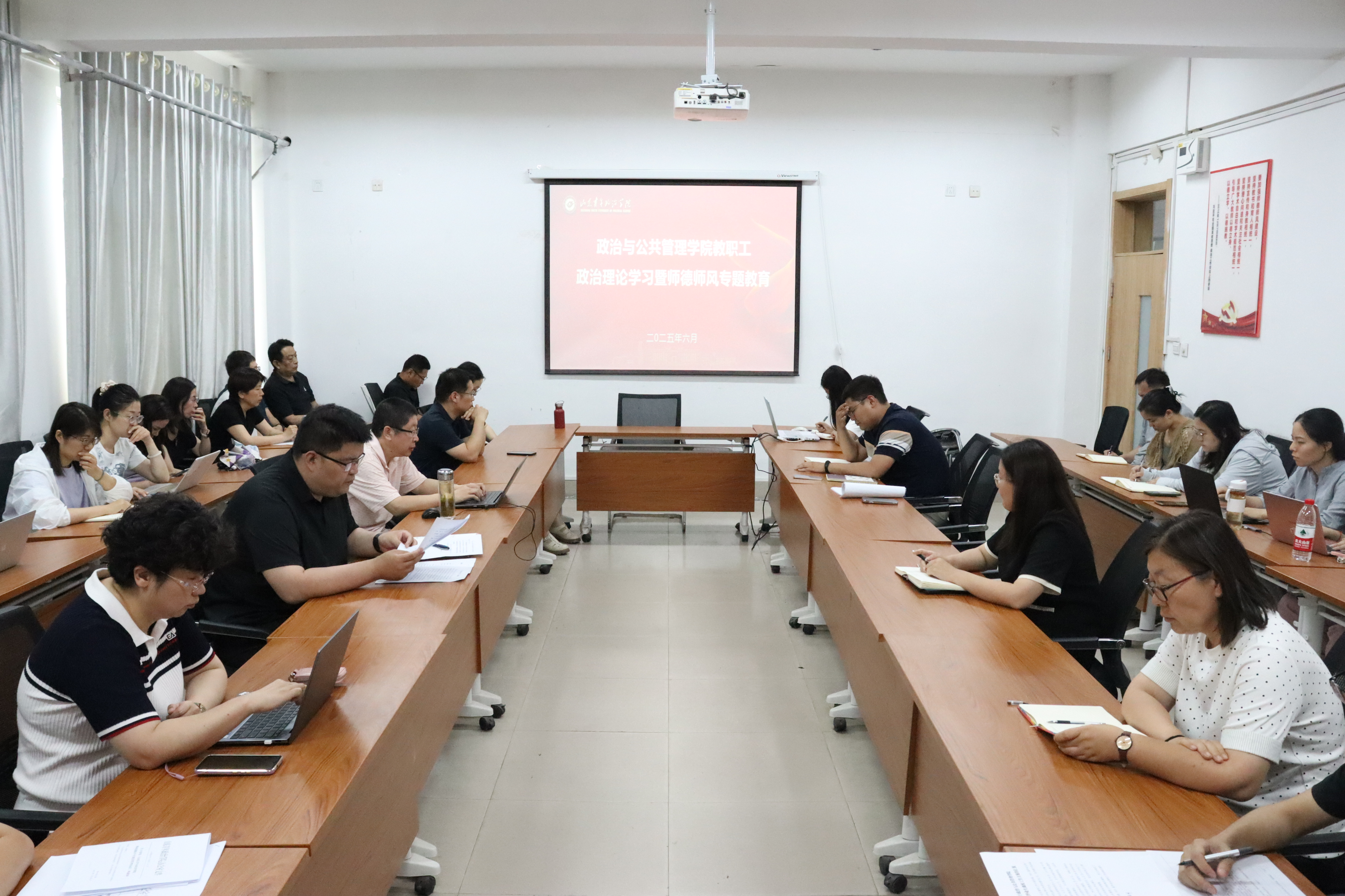 6月12日,政治与公共管理学院在敏行104会议室召开教职工政治理论学习暨师德师风专题教育会议,学院党委书记王正坤主持并领学,全体教师参会。