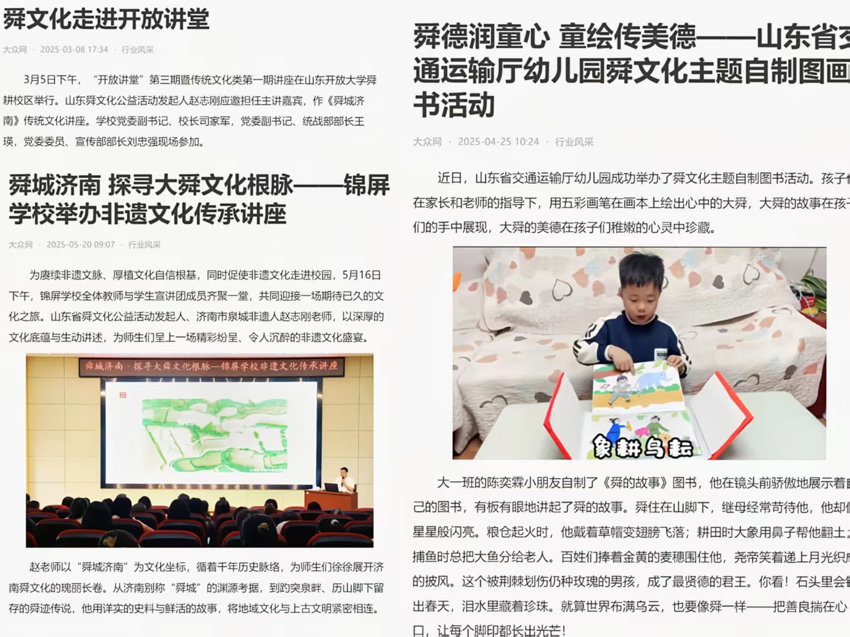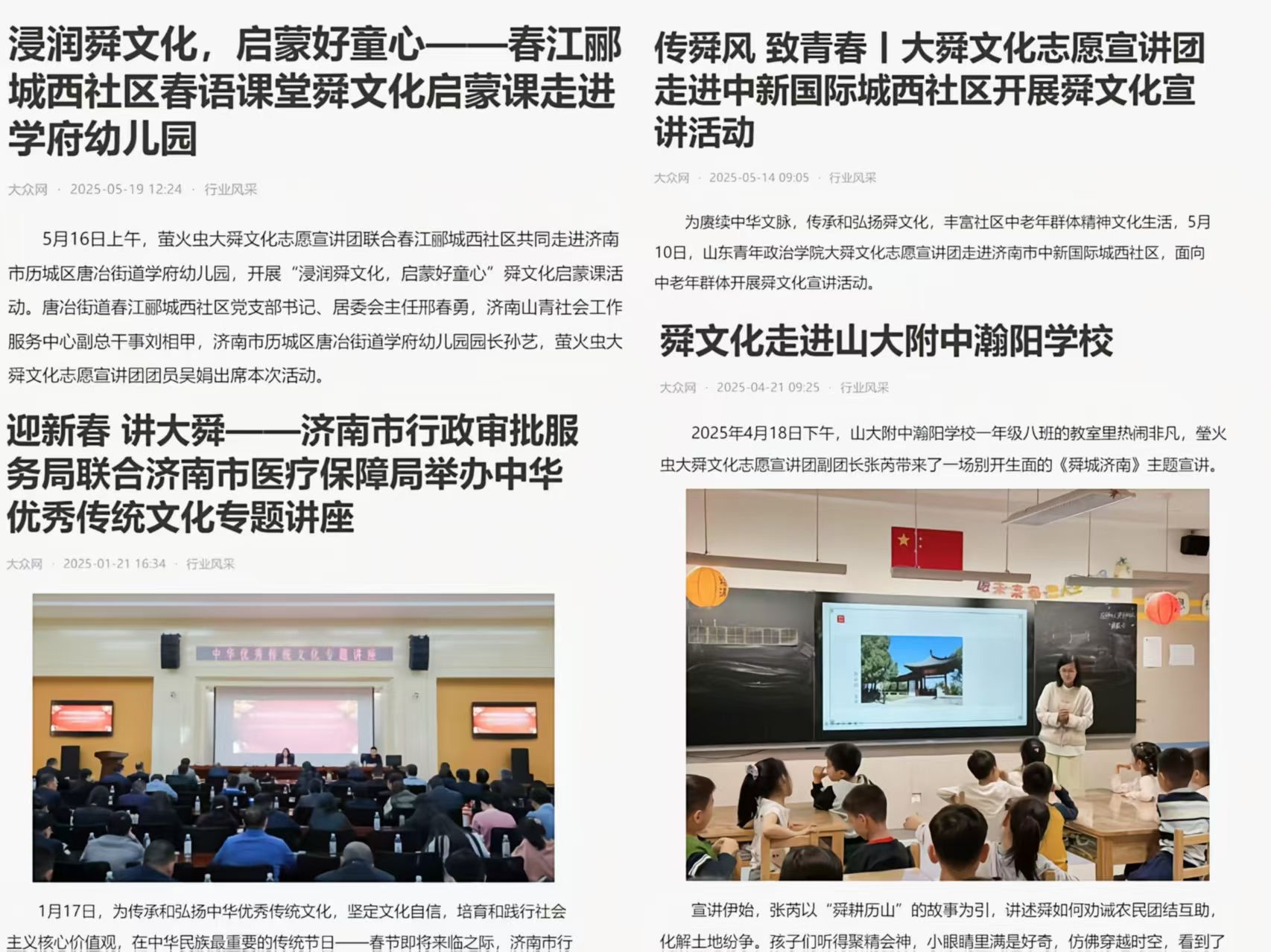 自新时代立德树人工程齐鲁行动启动以来,舜文化公益联盟将舜文化宣讲作为“德润心灵筑基工程”项目的重要组成部分重点推动。山东青年政治学院大舜文化志愿宣讲团、螢火虫大舜文化志愿宣讲团、山东省交通运输厅幼儿园大舜文化志愿宣讲团等山东省二十余支舜文化宣讲团队,面向社会公开开展宣讲120余场,服务覆盖15000余人次,做法事迹先后被大众网等多家媒体报道,构建了“舜魂凝力,多方协同”的宣讲新生态,掀起了传承与创新舜文化的热潮,为新时代立德树人工程齐鲁行动计划注入鲜活的文化动能。