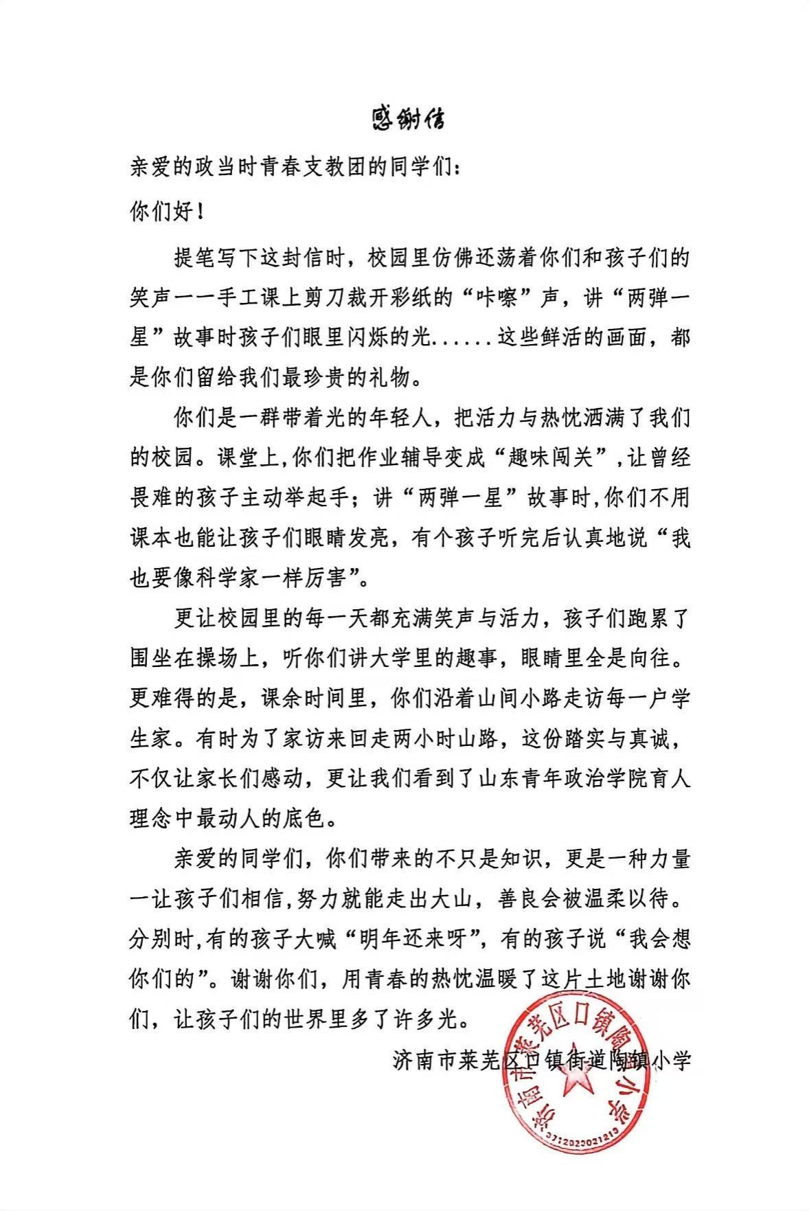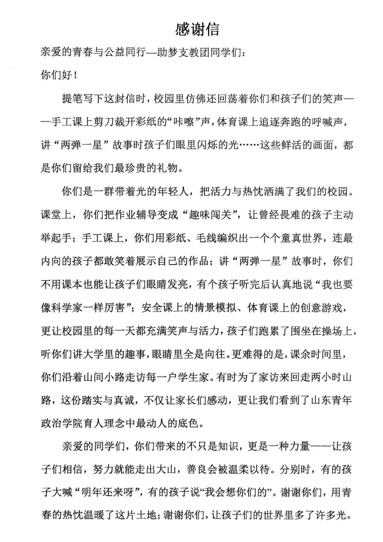 近日,政治与公共管理学院山青政论学社收到了来自临沂市费县薛庄镇八一爱民小学(辛锐小学)和济南市莱芜区口镇街道陶镇小学的感谢信。信中回顾了青春与公益同行——“助梦”支教团、政当时青春支教团在暑期开展的志愿支教活动,特别提到支教团通过趣味教学、家访走访等方式,为乡村儿童带来了知识与欢乐,展现了山青学子“知行合一”的优良品质。此次支教活动不仅为当地教育注入了新活力,更在校地合作方面取得了积极成效。