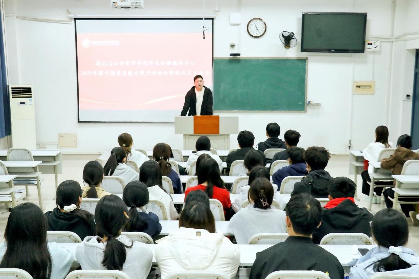为进一步提升学生会融媒体中心综合素质能力,推动学院宣传工作高质量发展,11月11日,政治与公共管理学院学生会融媒体中心2025年第十期素质能力提升培训会暨新成员见面会顺利举办。本次会议由学院学生会融媒体中心学生负责人高浩然主持,辅导员李新华与融媒体中心全体成员共同参加。