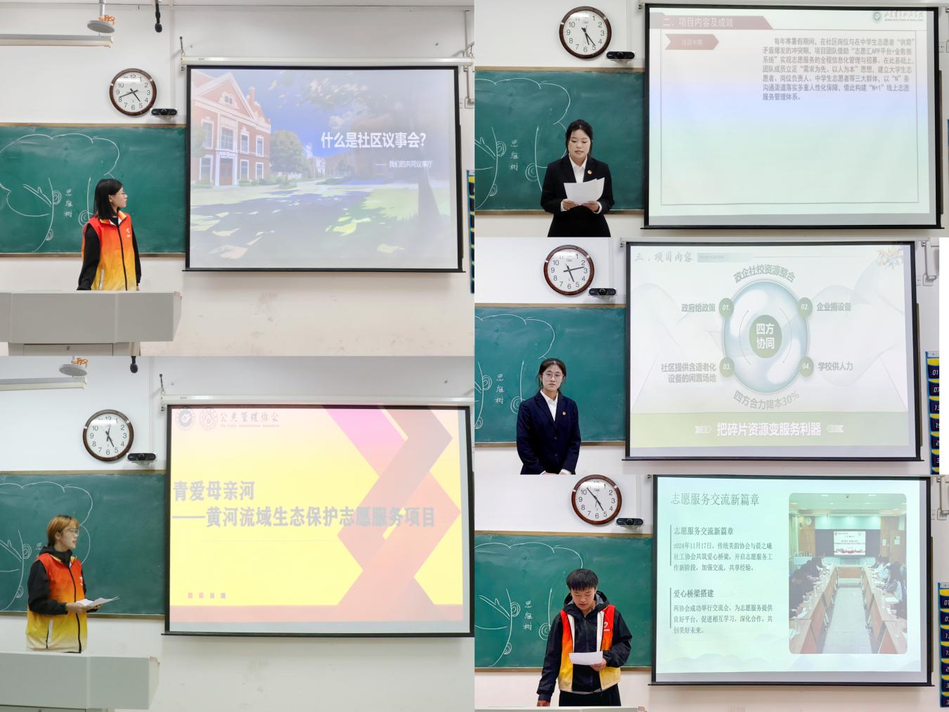 会上,各社团汇报人围绕品牌活动背景、活动内容、社会成效与未来规划等方面进行了系统阐述与汇报。讲解过程既有扎实的数据支撑,也有生动的案例呈现,充分展现了学生社团在实践育人、服务社会方面的积极探索与独特价值。在同步开展的点评互动中,王婧与李新华依次对汇报进行针对性点评,分别从项目的公益性、落地性与创新性等关键方面出发,结合各项目特点提出了优化建议,为后续品牌活动的持续深化指明了方向。